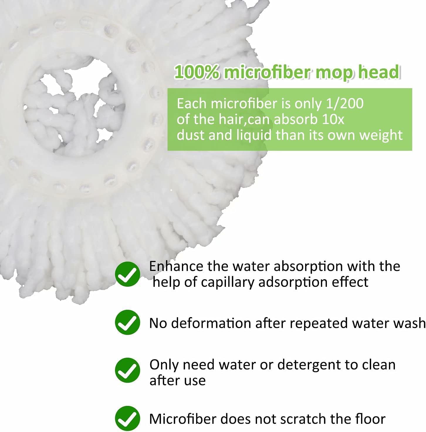 Efficient & Strong Cleaning – super absorbent microfiber mop heads grab and pick up 10 times liquid and messes. The liquid is trapped inside the microfiber and does not drip. Durable and won’t scratch the surface of any floor.