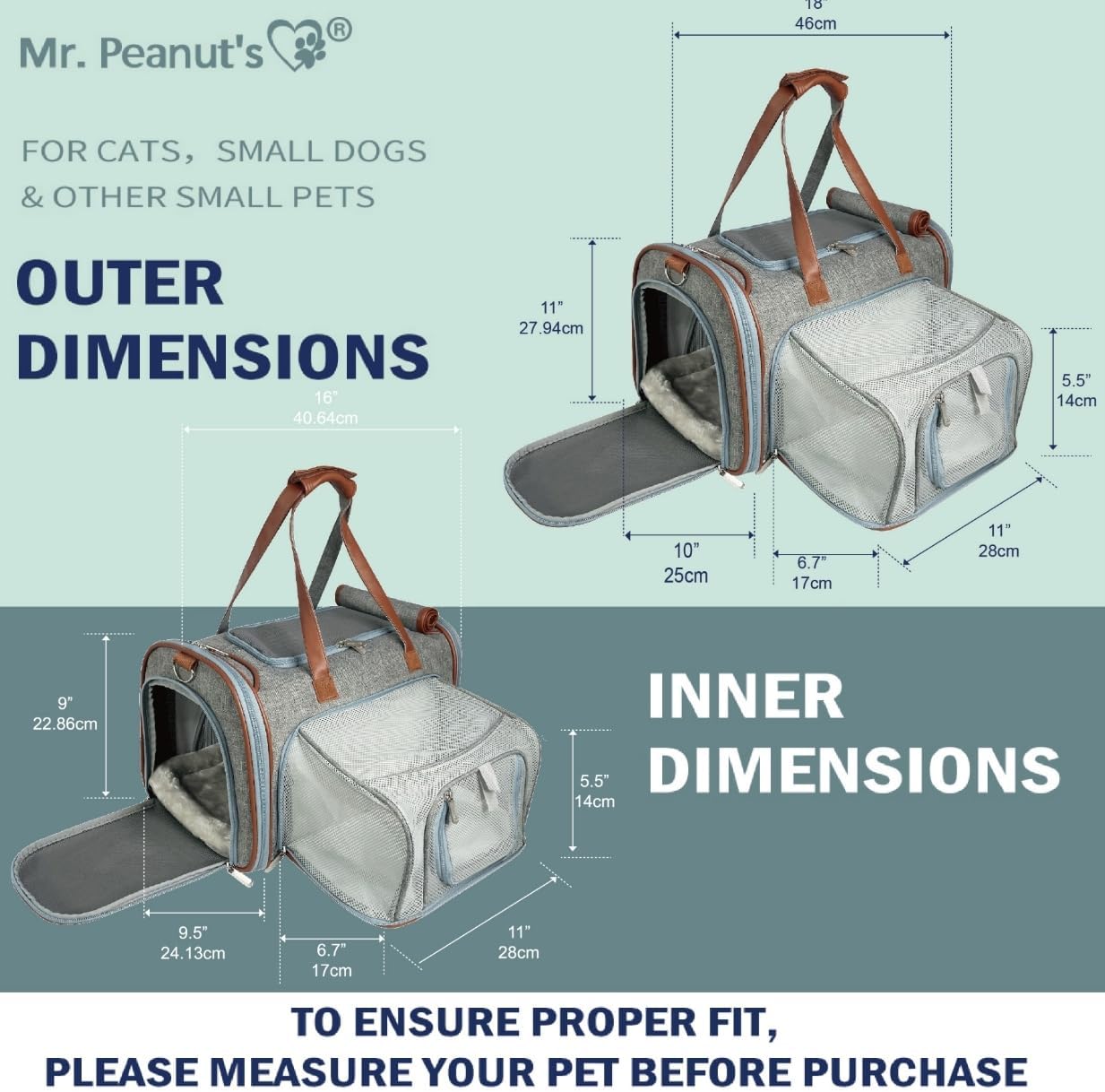 The smaller Mr. Peanut’s models such as the Gold Series Mini and Rhodium Series Mini are about 14” (35.5cm) on the interior length and about 8.5-9” (23cm) of interior height. Best fitting for pets like small cats, Chihuahuas, Yorkies, Maltese, etc