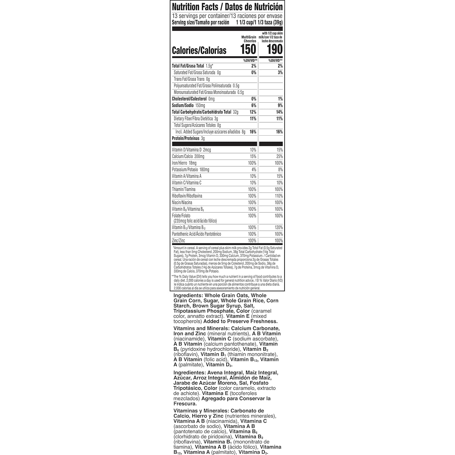 General Mills Multi Grain Cheerios Heart Healthy Cereal combines whole grains for a perfect balance of nutrition and taste to help you get through your day. This gluten free cereal is made with whole grain oats, whole grain corn, whole grain rice and whole grain sorghum. These grains are grown, milled and toasted before being lightly sweetened, resulting in a delicious heart healthy cereal for adults and children with more of the goodness you are looking for in every spoonful. Serve this multigrain toasted oat cereal for breakfast, make it into cereal bars, prepare delicious snacks for toddlers or add it to your favorite trail mix. Made with whole grain oats, this gluten free cereal contains 3 grams of dietary fiber per serving and provides 100% of the daily value of nine vitamins and minerals. While many factors affect heart disease, diets low in saturated fat and cholesterol may reduce the risk of this disease. Multi Grain Cheerios Cereal is low in fat, saturated fat free and cholesterol free. This 18-ounce Multi Grain Cheerios cereal box contains 13 servings of multigrain cereal that can be stored conveniently at home for a quick breakfast food or heart healthy snacks. Whether you’re looking for easy toddler snacks, trail mix ingredients or a breakfast cereal for the whole family, General Mills cereals spread goodness from tots to grown-ups.