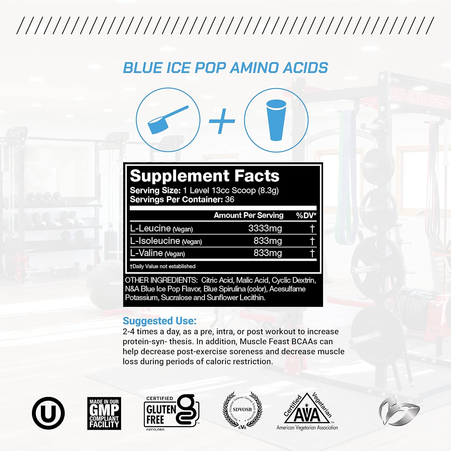 Muscle Feast BCAA 4:1:1 are instantized for optimal mixability and absorption. They can be taken 2-4 times a day, as a pre, intra, or post workout to increase protein-synthesis. In addition, Muscle Feast BCAAs can help decrease post-exercise soreness and decrease muscle loss during periods of caloric restriction.