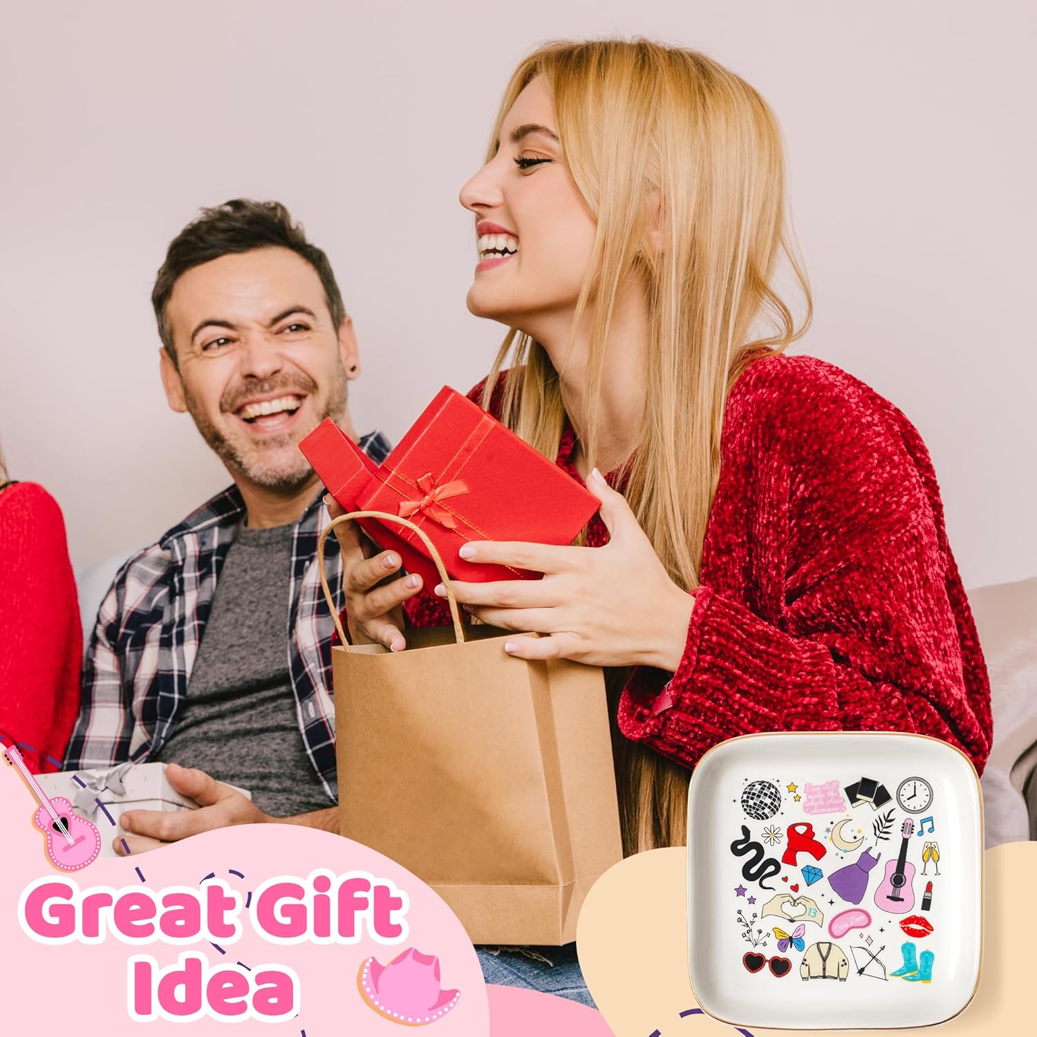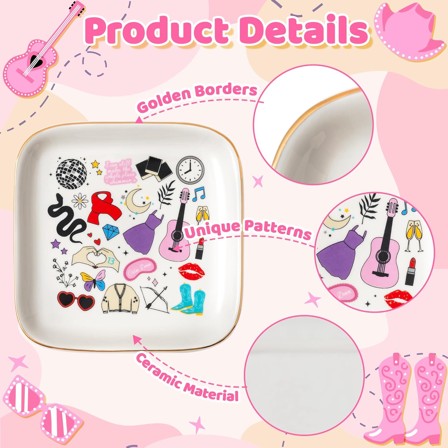 Adorable ceramic dish coated in cute little images of Taylor’s various albums and songs from throughout the eras. Works great on a nightstand to hold jewelry and loose change and such. Came well packaged and would make a wonderful gift. Would buy again.