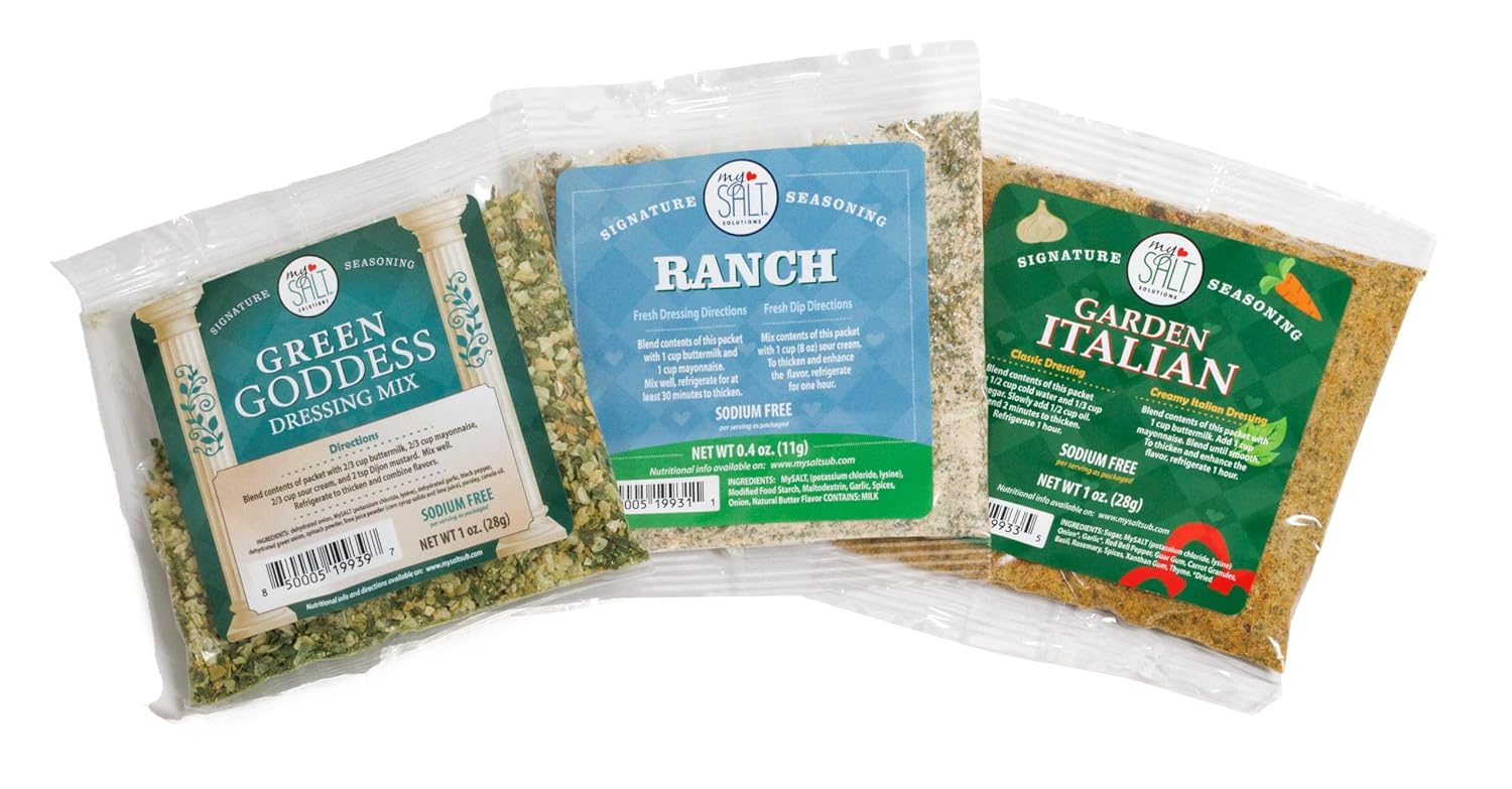 We have recreated these (normally) high sodium, quick and easy seasoning mixes that we all miss most! All 3 are sodium free – made with MySALT salt substitute.