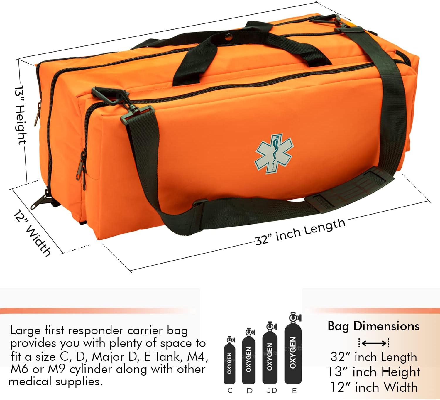 SPACIOUS OXYGEN CASE – Perfectly sized to hold oxygen O2 and respiratory gear along with a variety of medical supplies and equipment such as OBVMs, nasal cannulas, nasal catheters, etc. Bag dimensions: 32″(L) x 12″(W) x 13″(H).