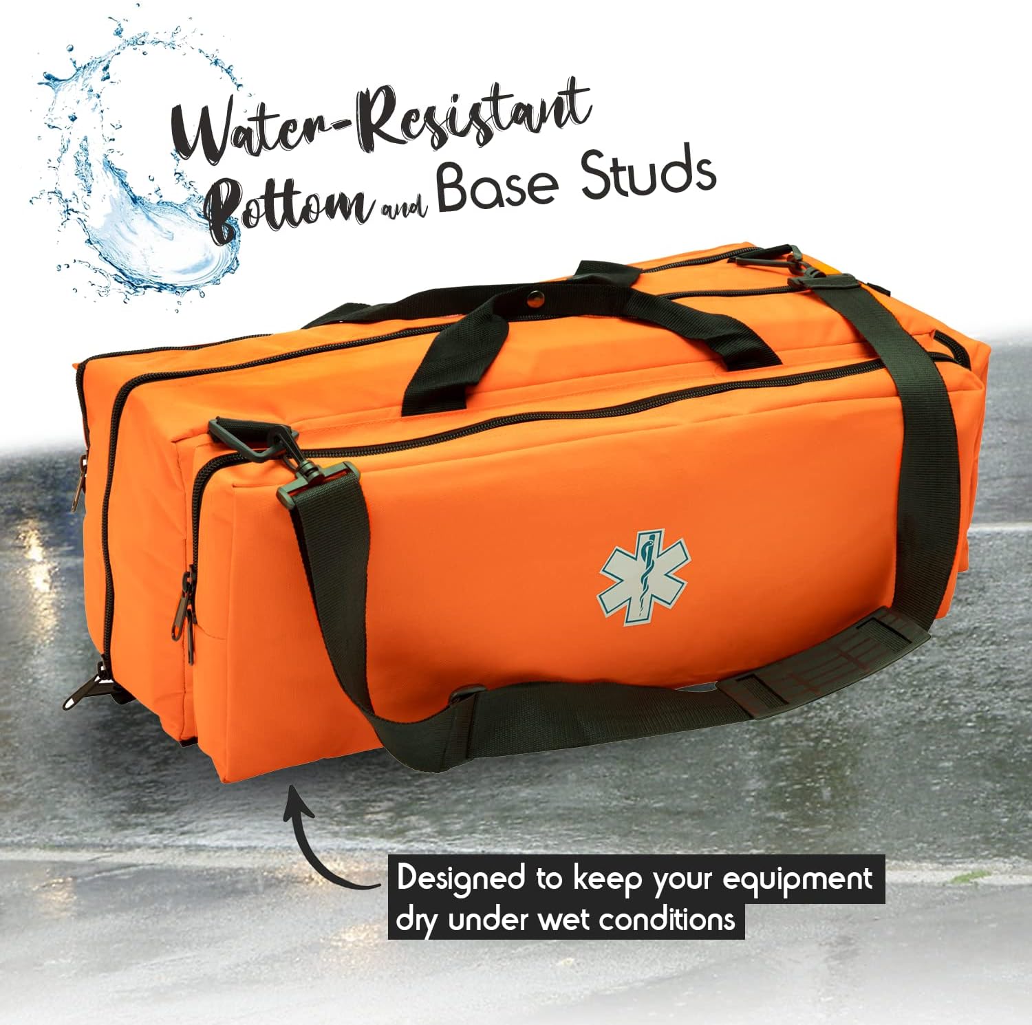 HIGH QUALITY – The case is made from heavy-duty durable nylon material, reinforced steel rings and clips, and heavy-duty zippers. It has a water-resistant bottom and base studs designed to keep your equipment dry under wet conditions. A reflective medical symbol is featured on the front of the bag for easy recognition in the dark.