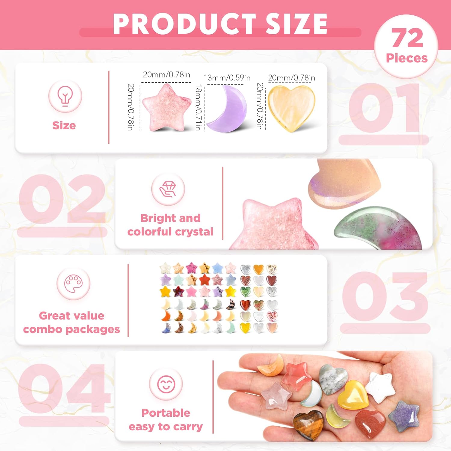What You Will Get: package includes 54 pieces of crystal stones, with 3 different shapes, moon, star and hear, with multiple colors; Sufficient quantity and styles can meet your assorted demands, and you can share them with family and friend