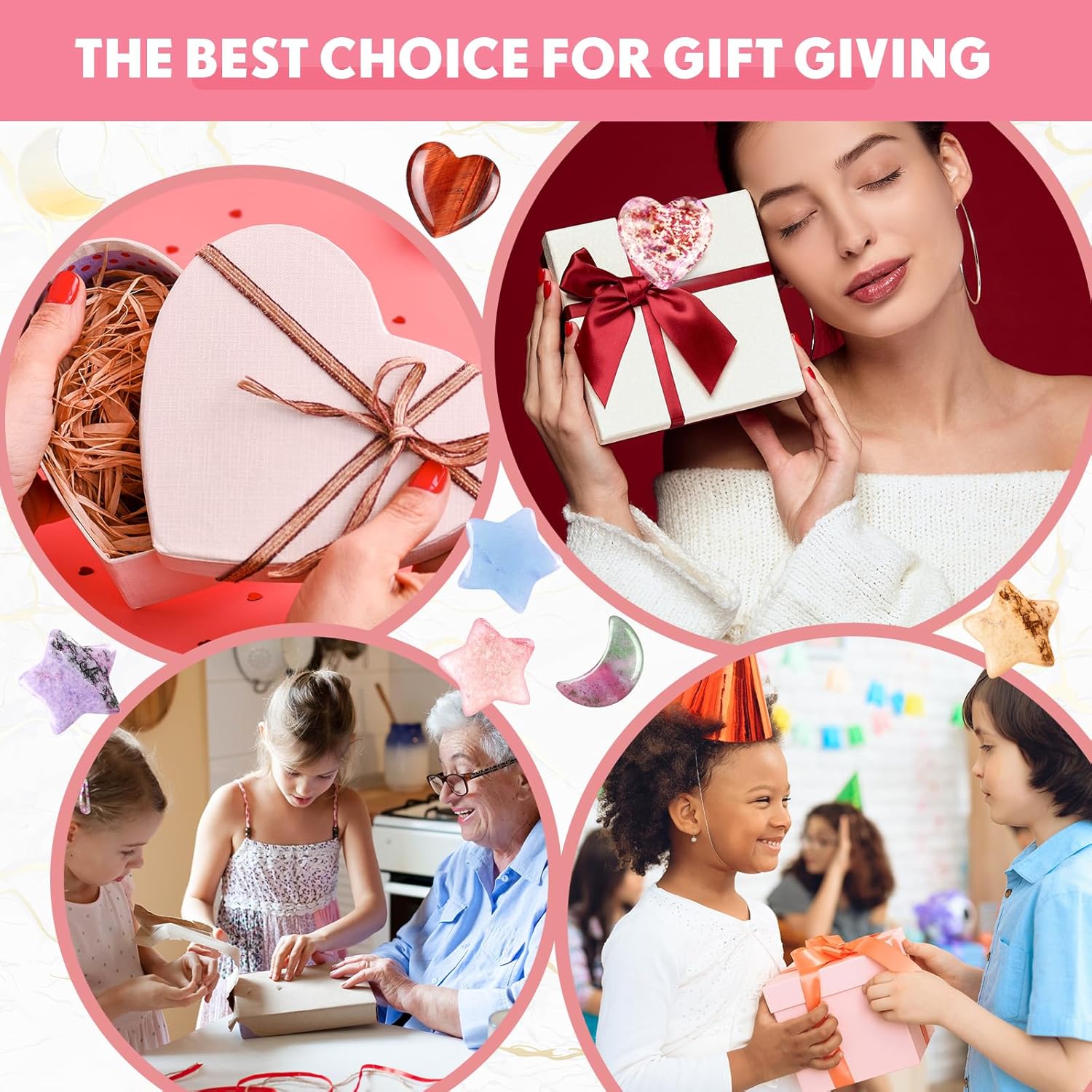 Nuenen 54 Pcs Worry Stones Bulk Heart Moon Star Natural Crystal Stones Tiny Crystals Gemstones Assorted Thumb Quartz Crystal Stones for Graduation Teacher Gift Meditation Balancing DIY(Cute Color)