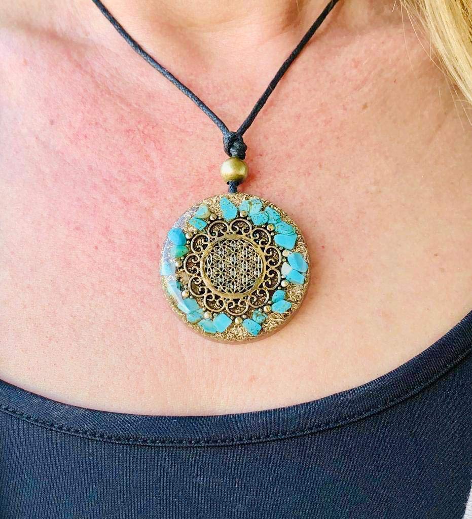 8 reviews for Orgone Necklace, Protection, Symbol Flower of Life, Sacred Geometry, Stone Turquoise, Gems Rose Quartz- SBB Coil, Reiki, Yoga, Healing Crystals, Orgonite Pendant Handmade, Arte Orgones