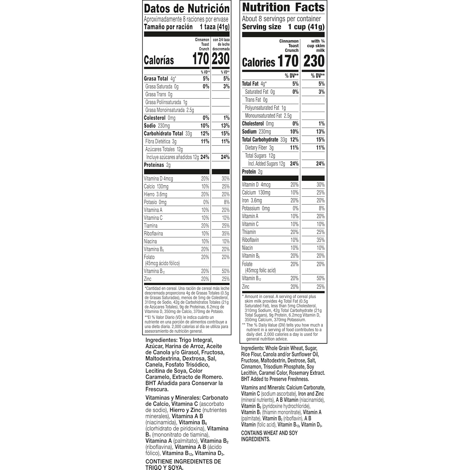 Wake up to the epic combination of cinnamon and sugar in General Mills Cinnamon Toast Crunch Breakfast Cereal. Every crispy square is blasted with CINNADUST, the irresistible mix of real cinnamon and sugar that makes your mouth happy. Just pour a bowl and add milk. Don’t forget to slurp up the CINNAMILK—the delicious cereal milk you find at the bottom of your bowl after enjoying Cinnamon Toast Crunch Cereal. Parents like that each crispy square is made with whole grain wheat, and without high fructose corn syrup or artificial flavors. Plus, every serving provides vitamins and minerals as part of a delicious kids breakfast. The classic kids snack is a favorite with grown-ups, too. Enjoy this crunchy cinnamon cereal any way you like. Sprinkle the crispy squares over a sundae as ice cream toppings. Nibble from a bowlful as party snacks. Or pack them in your brown bag lunch. Explore all the fun creations you can make with Cinnamon Toast Crunch recipes from General Mills, including cereal bars, snack mixes and cakes. This 12-ounce box contains about 8 servings of sweetened rice and whole wheat cereal. Whether you’re looking for delicious kids snacks, trail mix ingredients or a breakfast cereal for the whole family, General Mills cereals spread goodness from tots to grown-ups.