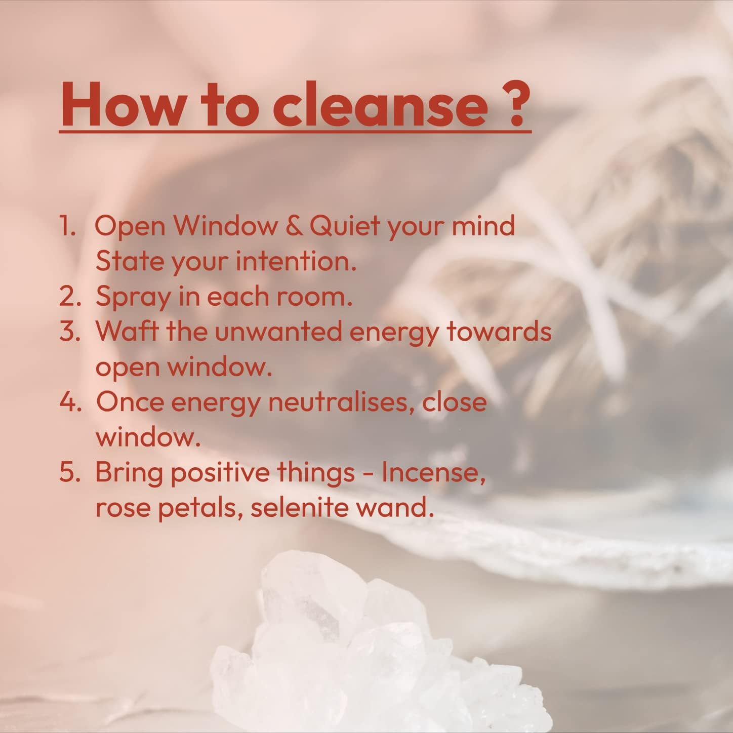 HOW TO CLEANSE? – Open your windows, quiet your mind and set your intentions. Then, spray in each room you are cleansing starting in each corner. You can waft the air and energy you want to remove toward the open window. Once the energy has become neutral, close the window, and add the Selenite wand to keep more negative energy out. At the end of your cleansing, bring positive things into your environment: a flower, some rose pedals, light a candle that you love, etc.