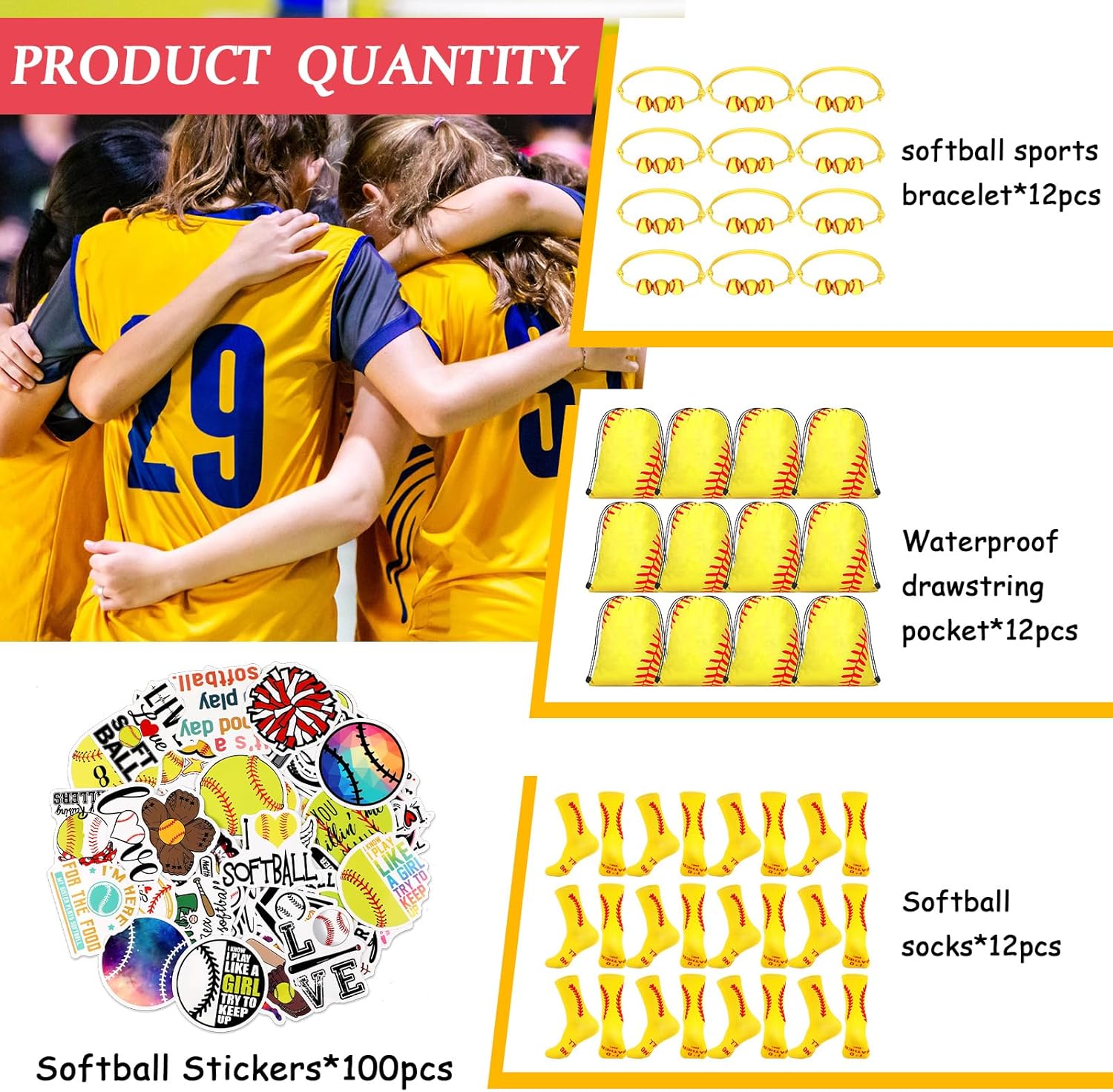 Panitay 12 Sets Softball Party Favor Gift Sport Socks Softball Drawstring Bags Softball Stickers Bracelets for Boys Girls