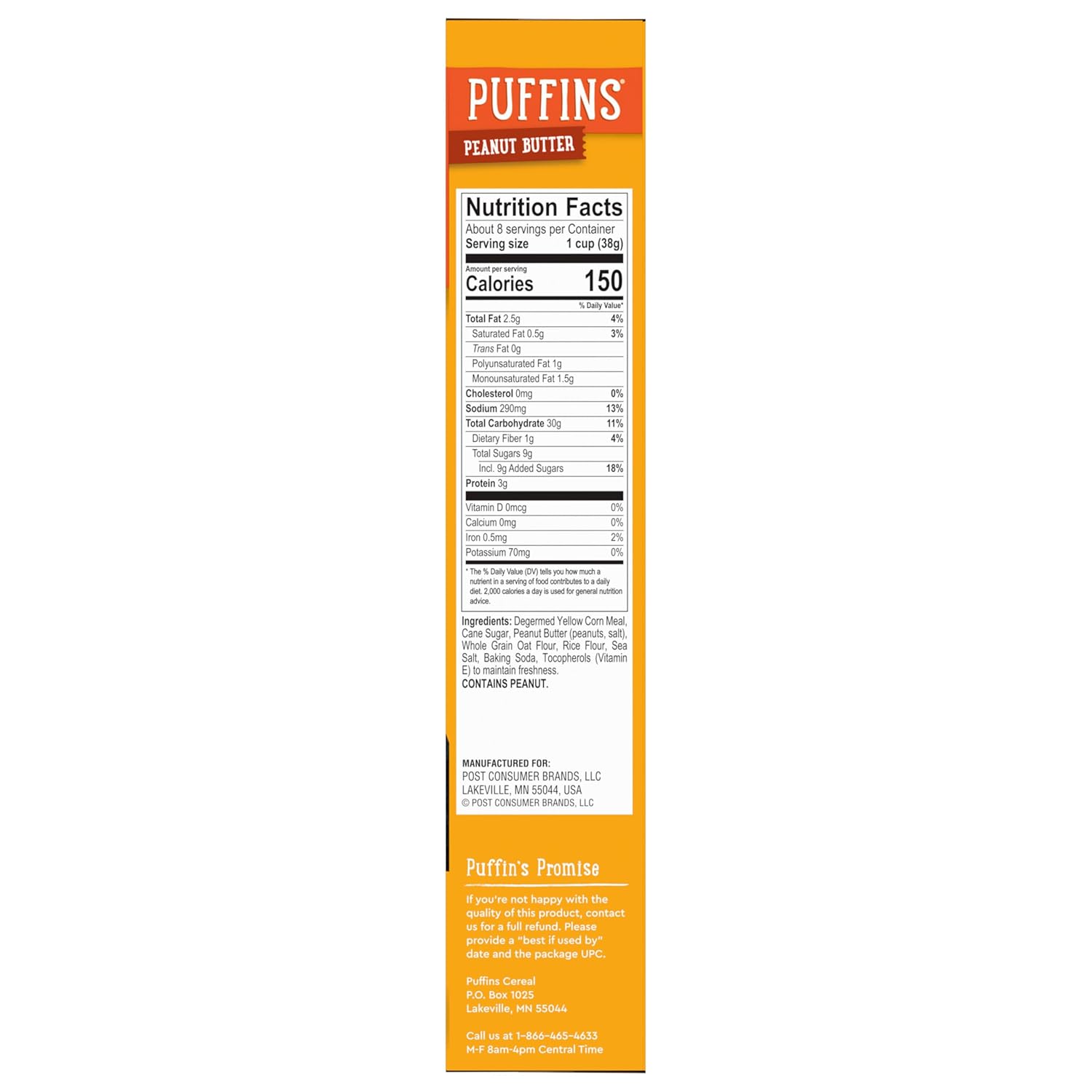 Greet your day with a grin and enjoy a big bowl of happy with Peanut Butter Puffins Cereal. Peanut Butter Puffins kids cereal has the perfect amount of puffiness and sweetness that kids love. This crunchy and delightful puffed cereal has 9 grams of sugar per serving. Nourish your family with this Non-GMO Project Verified peanut butter cereal that tastes good because it is good. Each box of Peanut Butter Puffins Cereal is vegan and kosher to accommodate a variety of family diet preferences. Enjoy these fun oat and corn puff cereal pieces as an afternoon snack, or pour a loving bowlful for your kids in the morning and watch their eyes light up as they happily munch on these tasty puffed cereal squares. Store this 11-ounce box of Puffins Peanut Butter Cereal on your pantry shelf for easy access to serve as part of a quick kids breakfast or after school snack.