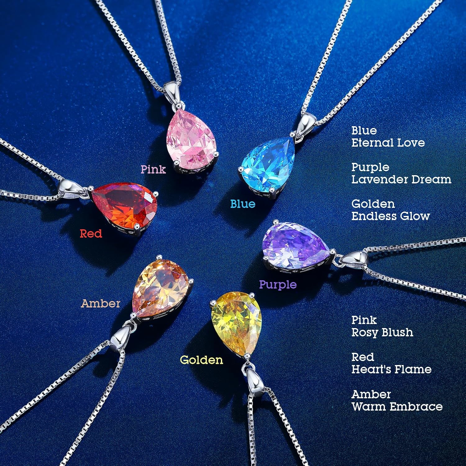 The shade of blue is gorgeous! The chain is 18″+2″ and made from shiny, rhodium plated stainless steel. The teardrop shape is lovely, delicate, and classy. This necklace comes with everything necessary to present the gift nicely. Included is a very nice, sturdy jewelry box, and a greeting card. I highly recommend this Heart of Eternal necklace, the quality is fantastic!!