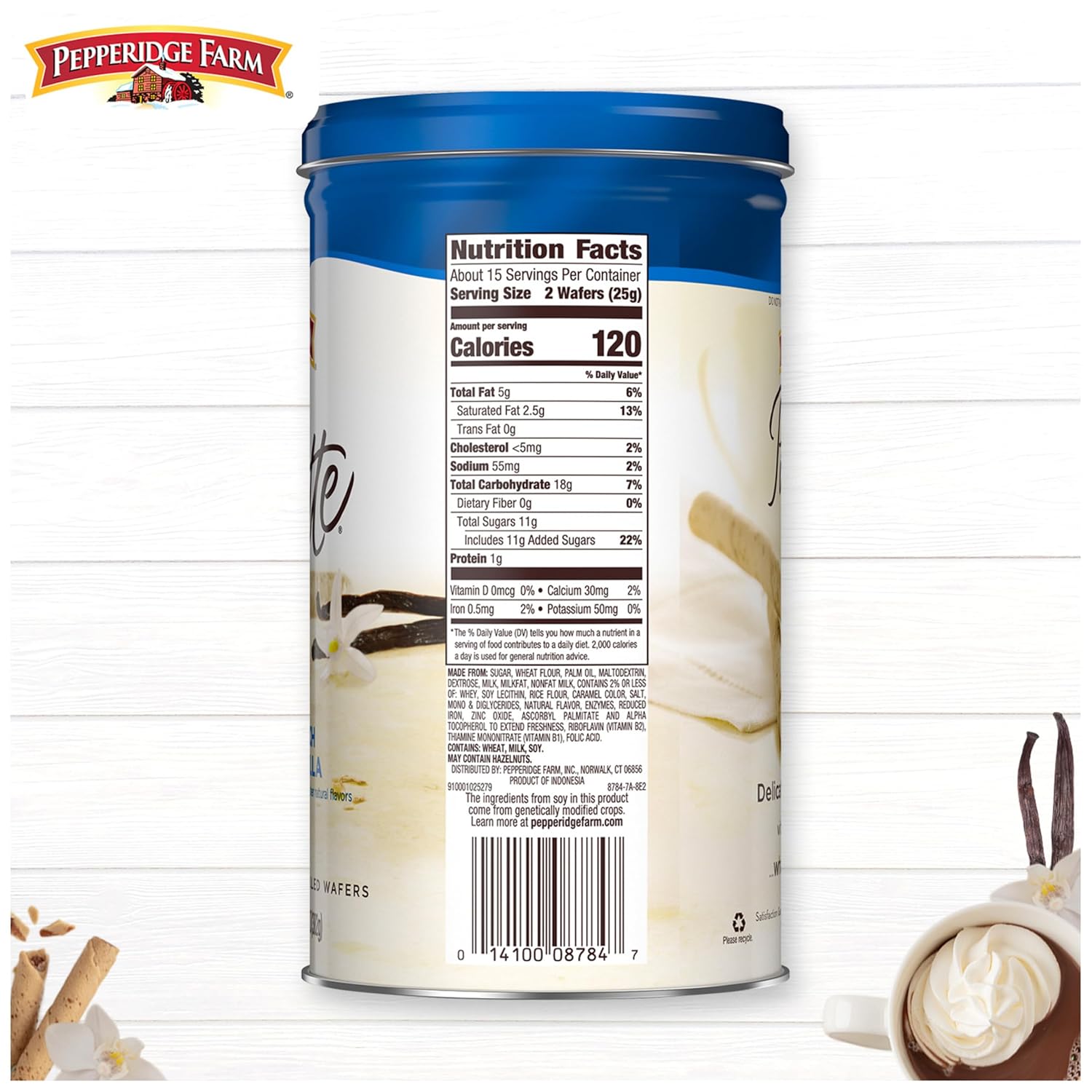 Whether paired with morning tea or coffee, added as an adorable cupcake decoration, or partnered with ice cream, Pepperidge Farm Pirouette French Vanilla Créme-Filled Wafers deliver absolute indulgence in every perfect bite. These pastry-like wafers are baked to a delicate crisp, and filled with a luscious, creamy vanilla flavored filling. They have a European flair that makes serving them extra special – even if it’s a treat just for you. The 13.5-ounce tin helps keep them fresh, so you can continue to savor the sophisticated sweetness. These Pepperidge Farm Pirouette French Vanilla Créme-Filled Wafers are beautifully crafted because, for Pepperidge Farm, baking is more than a job, it’s a real passion. Each day, our bakers take the time to make every cookie, pastry, cracker, and loaf of bread the best way they know how — by using carefully selected, quality ingredients. So go ahead and give in to delicious indulgence.