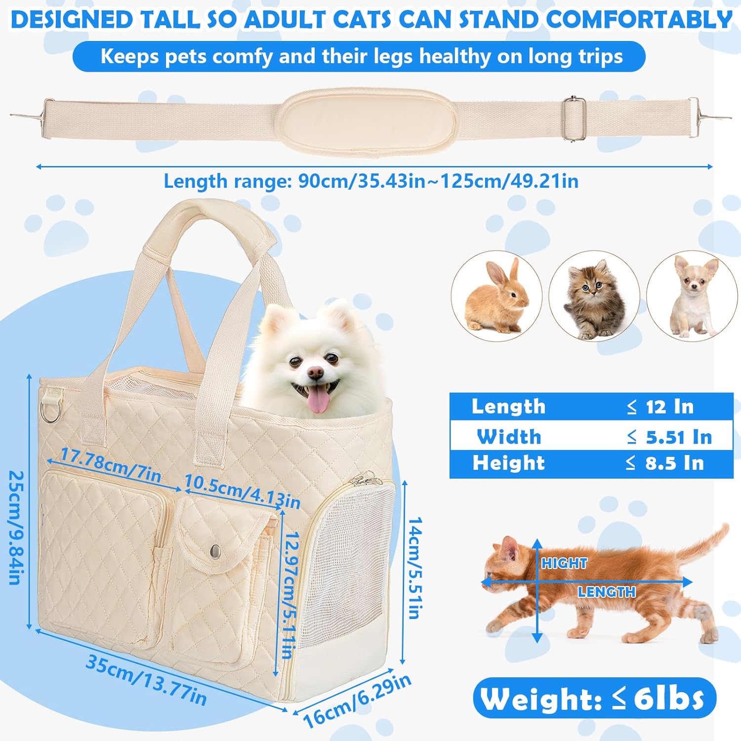 This carrier is very cute. Very well made. Very Very comfy for your pet. However,I have a 2 1/2 lb , very fluffy Pomerania. He felt cramped inside the carrier.Very nice carrier.