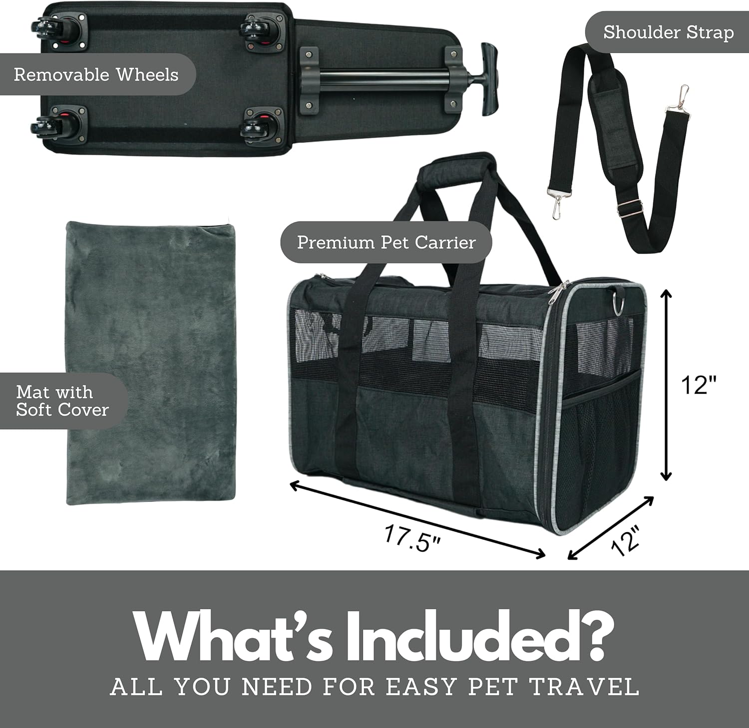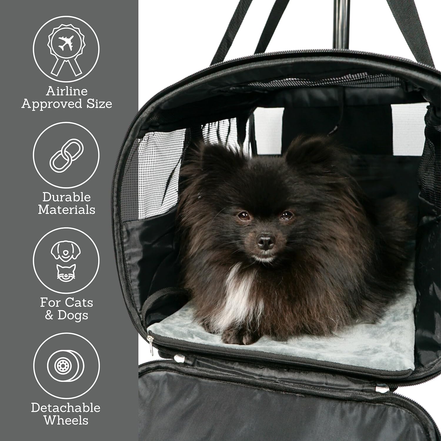 Pet Carrier with Wheels – Airline Approved – Rolling Pet Carrier – Soft Dog & Cat Travel Carrier – Small Dog Carrier – Removable Wheels – 17.5” x 12” x 12” – Black