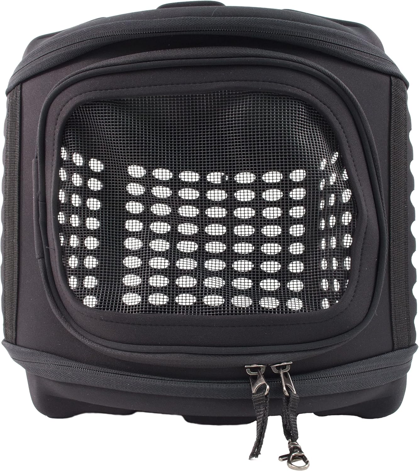 The superior lightweight perforate military grade collapsible circular shelled transporter pet carrier is composed of a unique tough lightweight pvc outer shell. The centered shell is composed of a unique thick blended and bendable tear-proof foam that can easily withstand large amounts of weight pressure. This dog carrier fully collapses to 3.5 Inches thin as both outer shells fully zip around 360 degrees as the tough bendable perforated centered durable foam is neatly placed inside the 2 shells. The zippers are specially engineered to carry over 80 lbs. of weight without breakage. Features dual above-top side mesh hard shell and mesh hinged entrance openings. Features bottom rubberized grips and comes with a built-in leash holder inside. Available in multiple colors. Sizing measurements in inches (l*w*h) 18.2 * 14.6 * 12.2.