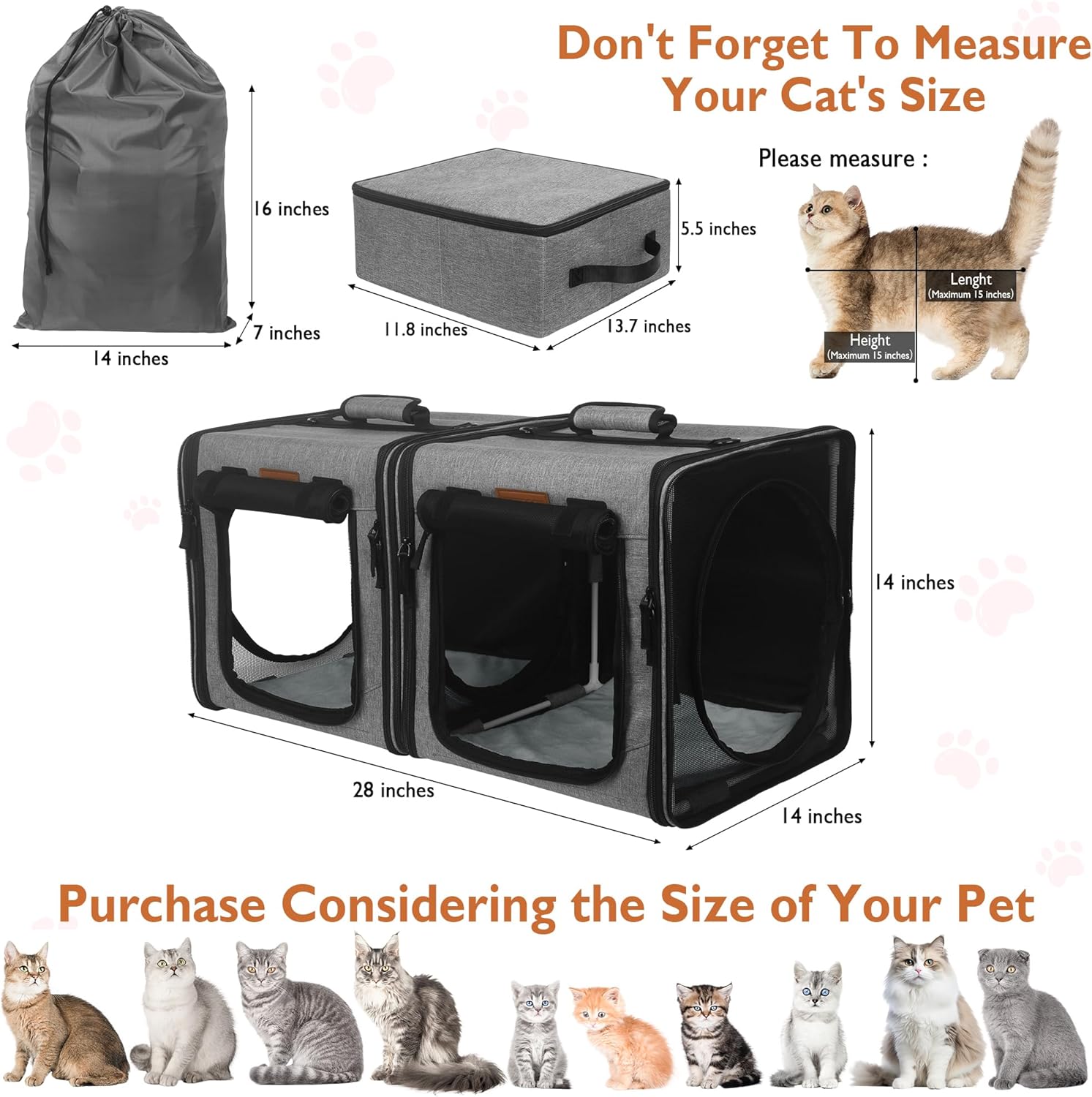 PETUX Small Cat Travel Carrier with Little Box, Portable 2-in-1 Double Pet Kennel Small Cat Carrier for 2 Cats, Cat Carrier Soft with Flannel Mat, Hammock, Protable Tote (Grey)