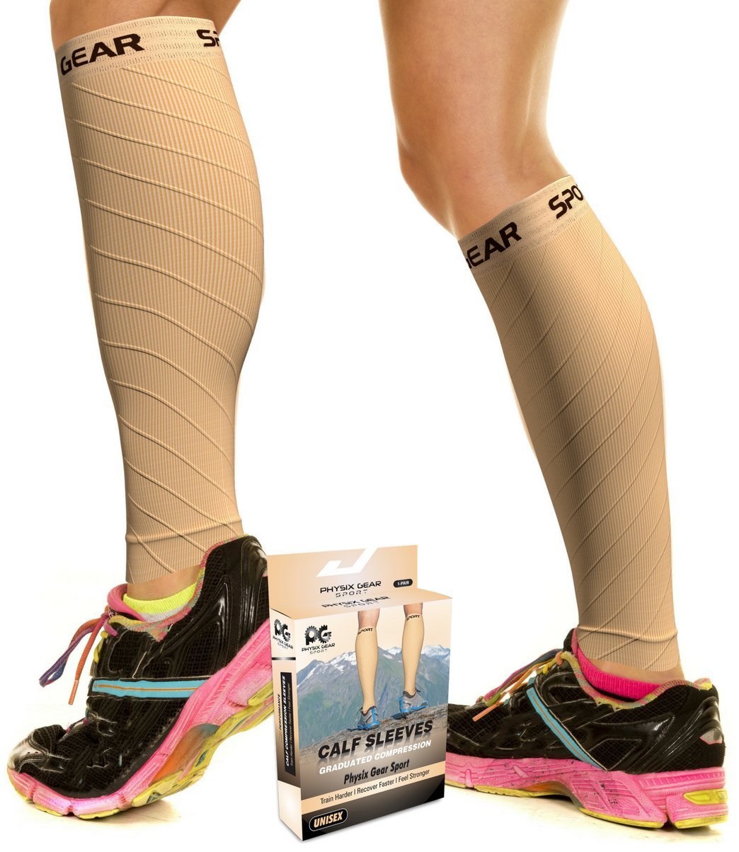 Physix Gear Calf Compression Sleeves for Women and Men – Calf Compression Sleeve for Running, Provides Calf Support and Shin Splints comfort, Compression Sleeves Calf for Enhanced, Beige/Nude, S/M