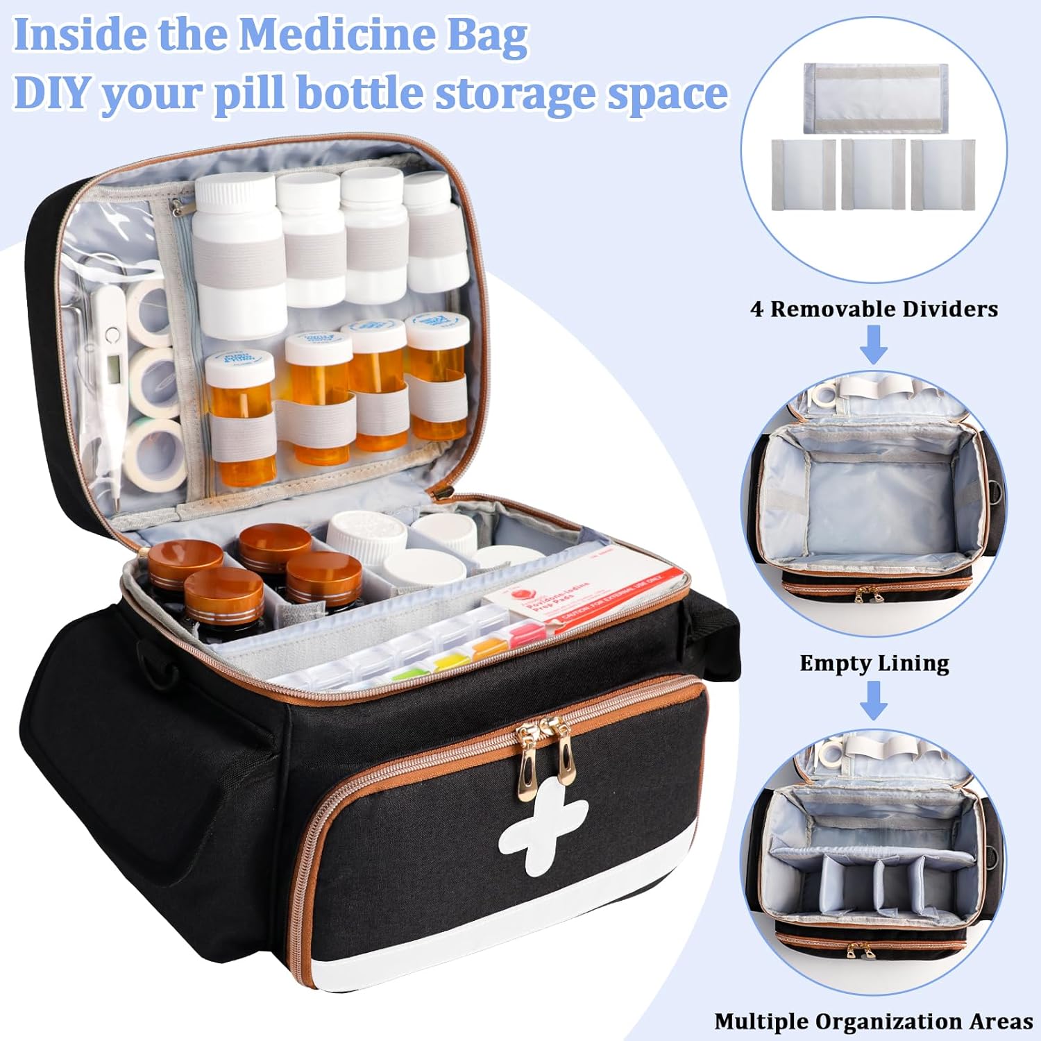 【Large Capacity & Multifunctional Front Pocket】This pill bottle organizer bag (13.4*8*7.6 inches) has a large main space, providing enough storage space for all your medical and first aid supplies. The front large opening zipper pocket can store different medical supplies, including stethoscopes.