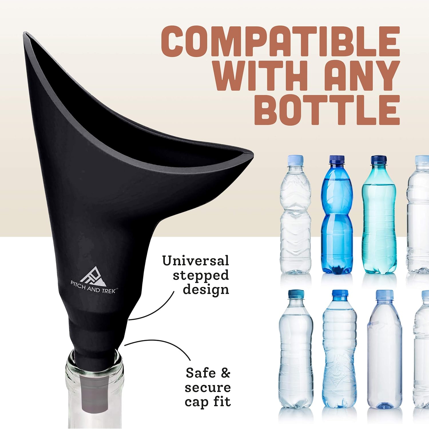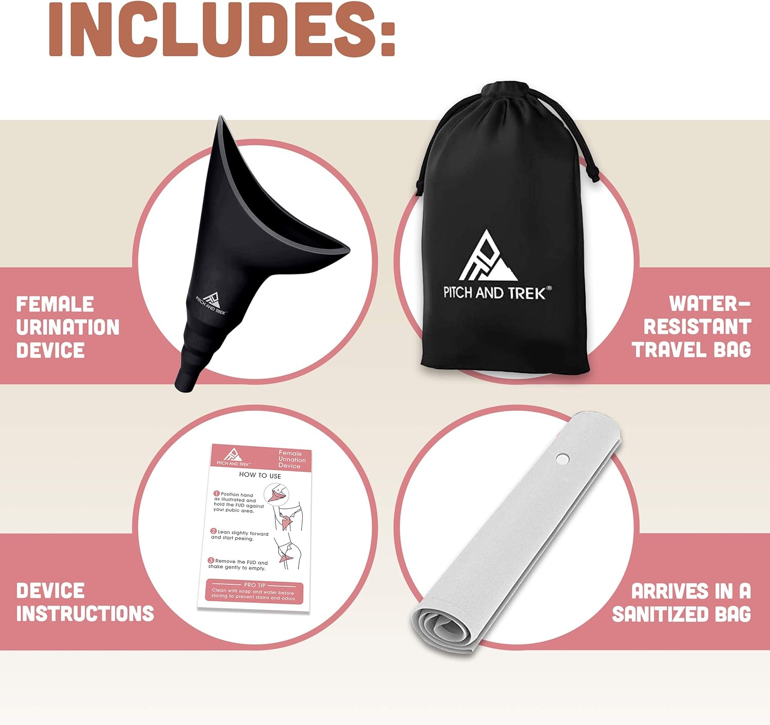 Pitch and Trek Female Urination Device, Silicone Standing Pee Funnel w/Discreet Carry Bag, for Travel, Road Trip, Festival, Camping & Hiking Gear Essentials for Women, Black