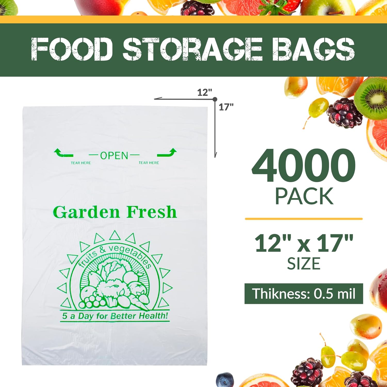 Plastic Produce Bag on a Roll “5 a Day for Better Health”, 12 x 17 Inch. Roll of 4000 Clear Food Storage Bags, 0.5 Mil. Roll of Plastic Bags for Food. Plastic Food Bags for Fruit, Cheese