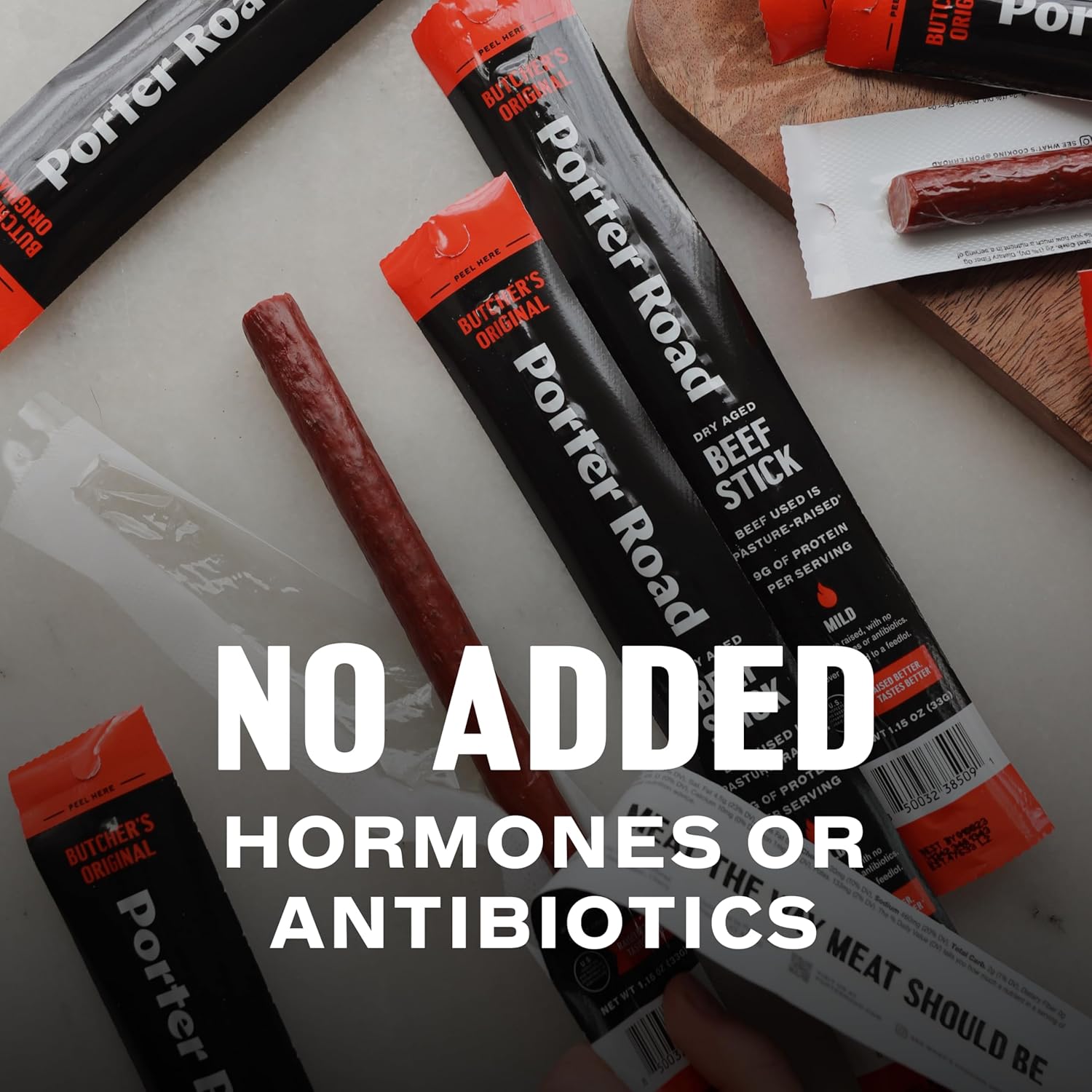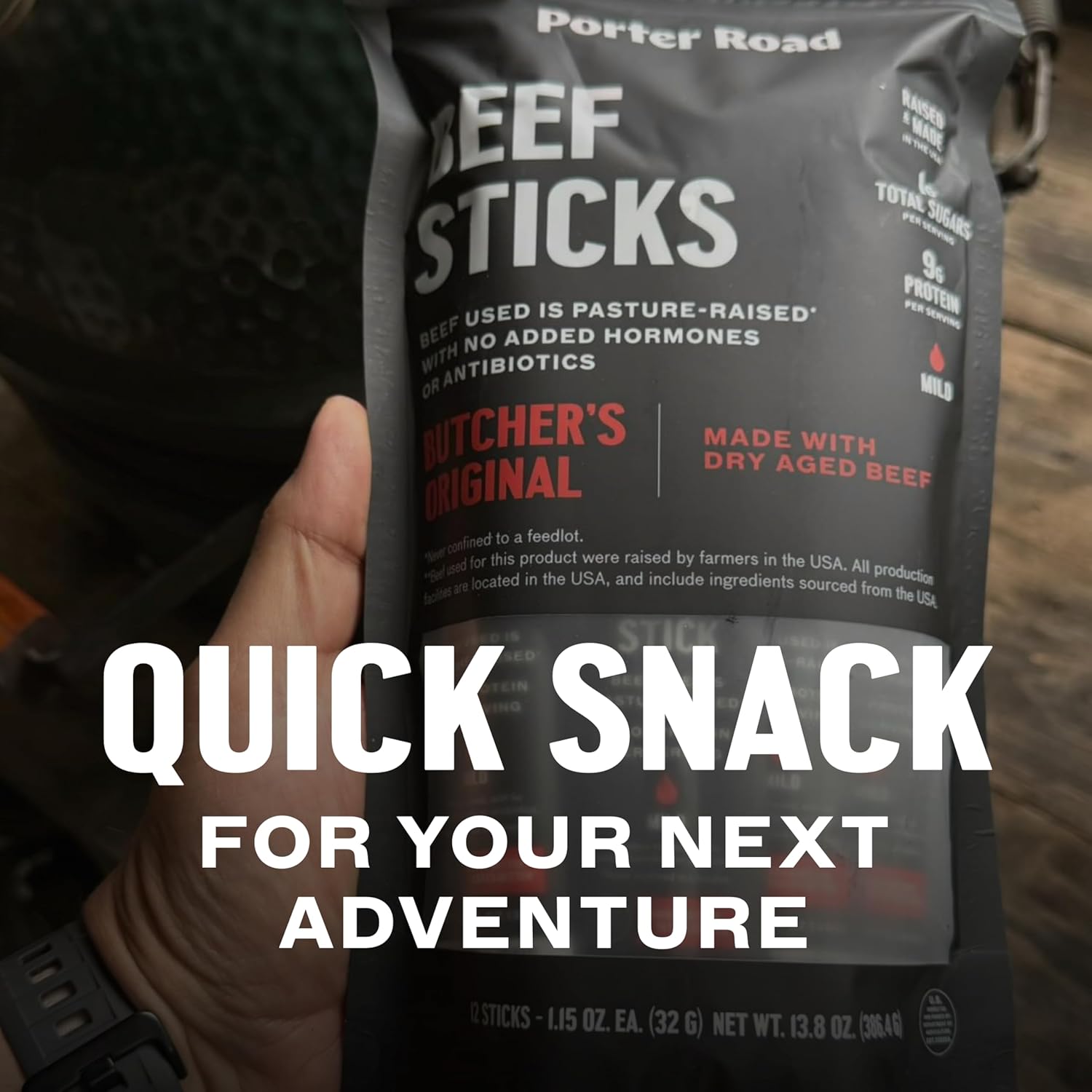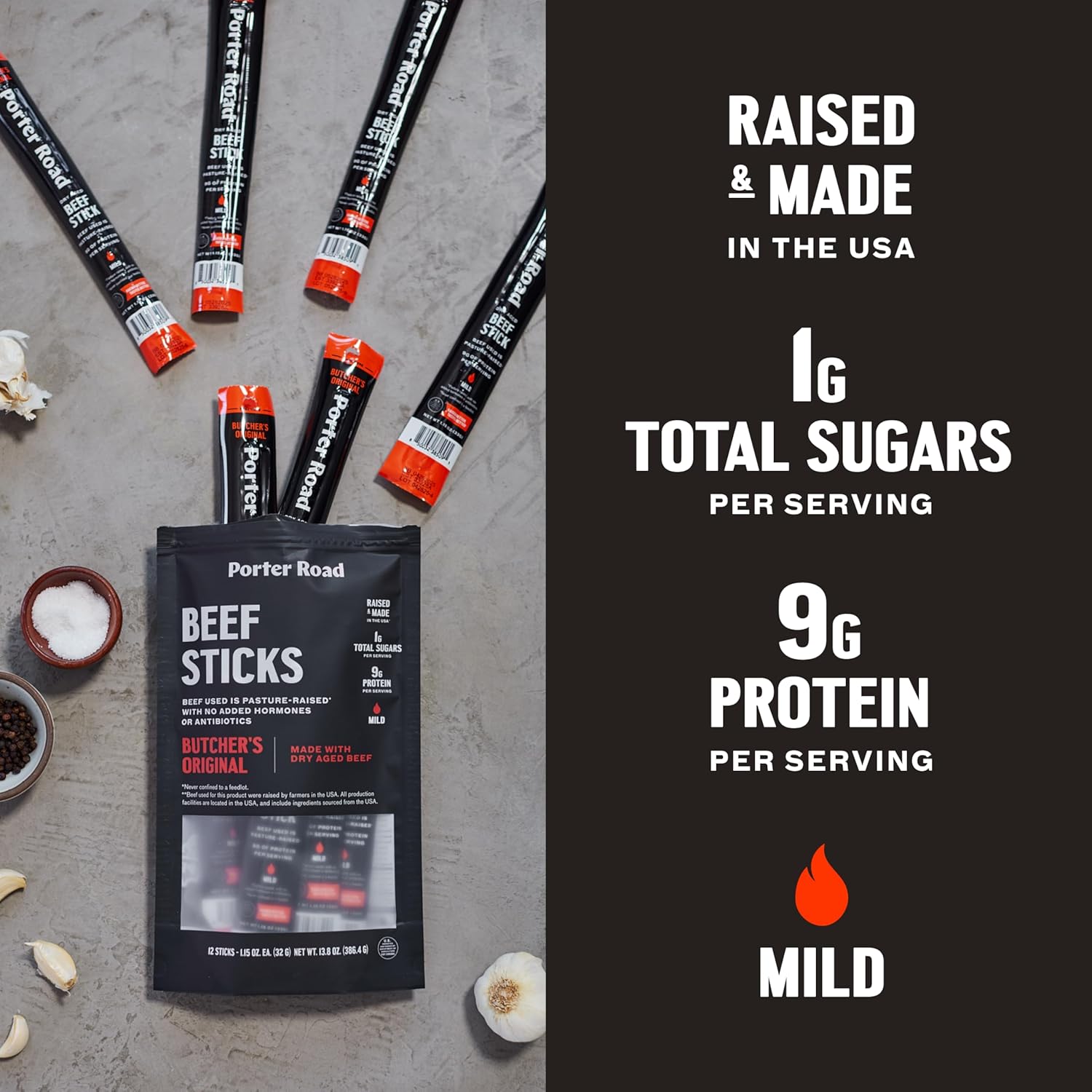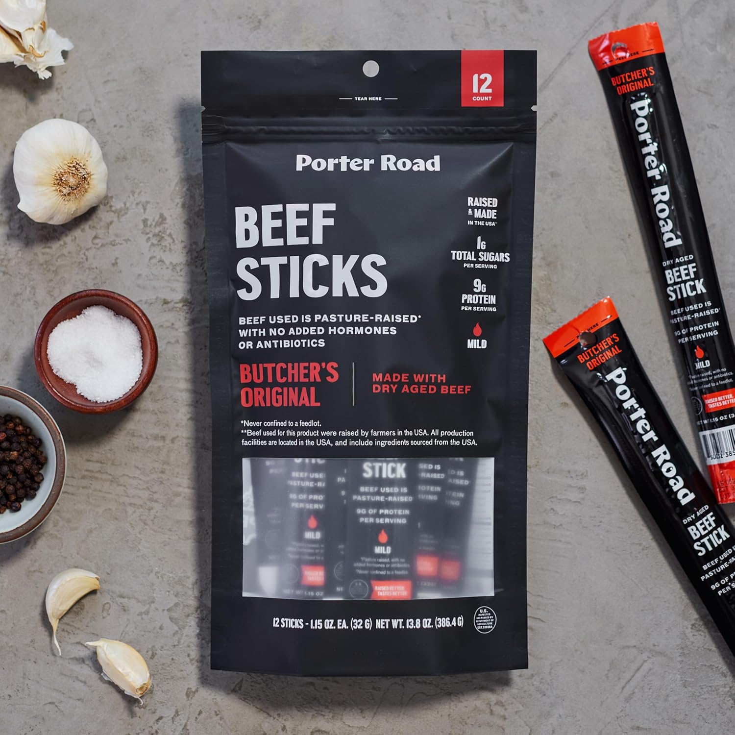 Porter Road Beef Sticks – Butcher’s Original Meat Sticks – Dry Aged Beef Jerky Sticks Meat Snack, Pasture Raised In USA, Hormone Free, No Antibiotics, Keto, Paleo, Gluten Free, 9g Lean Protein – 12 Pack