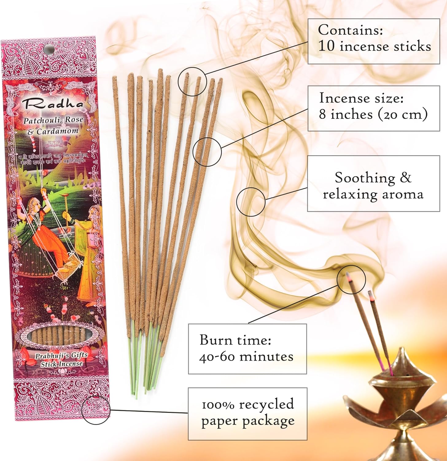Prabhuji’s Gifts Radha Hand-Rolled Spiritual Incense Sticks – Aromatic Sticks – for Meditation, Yoga, Relaxation, & Aromatherapy Incense – Patchouli, Cardamon, and Rose – 3 Packs of 10 Sticks