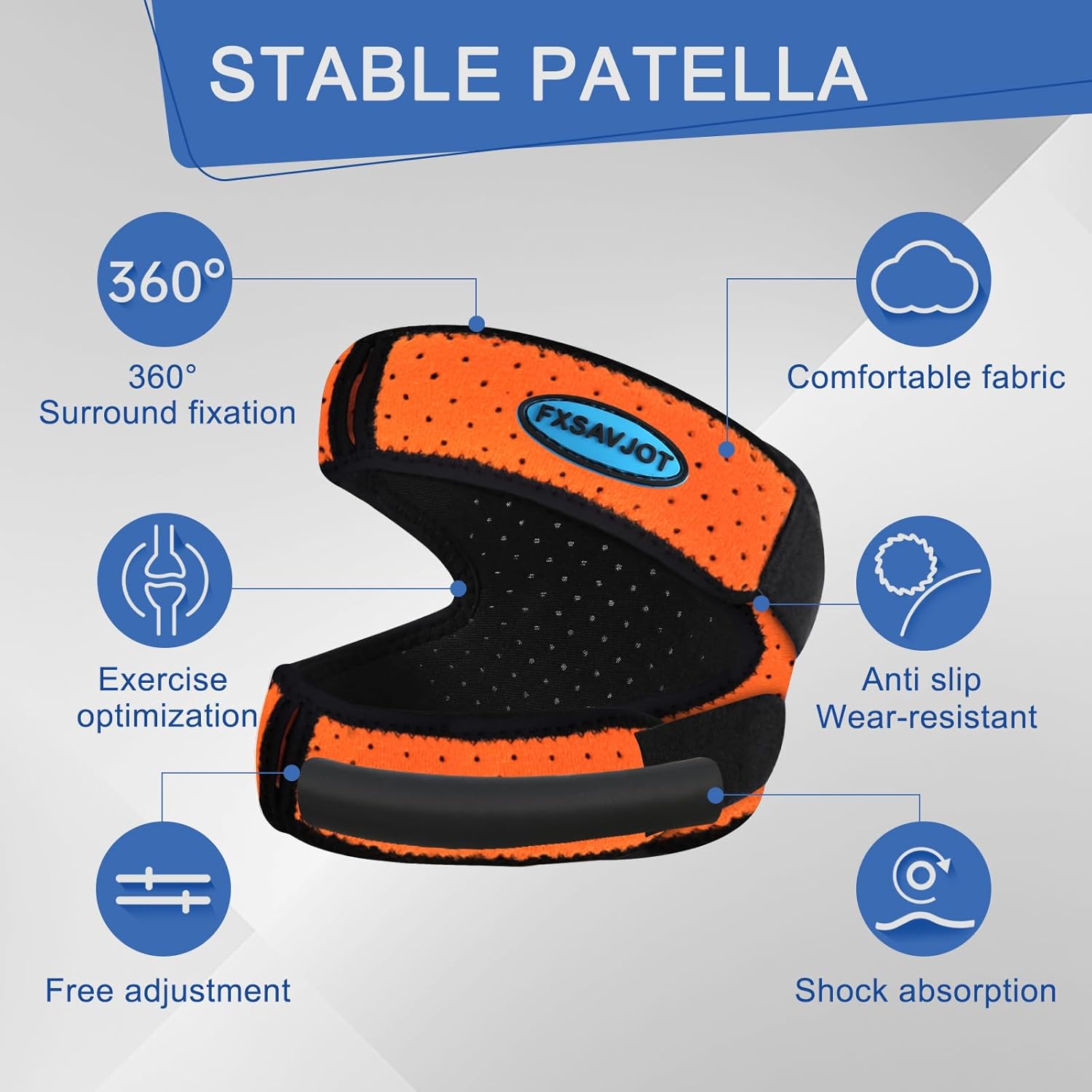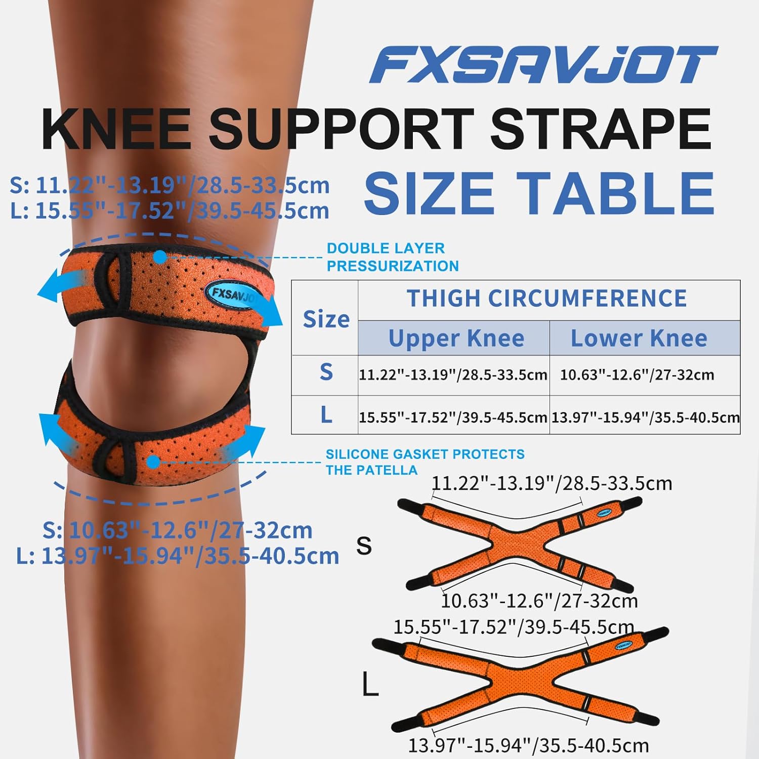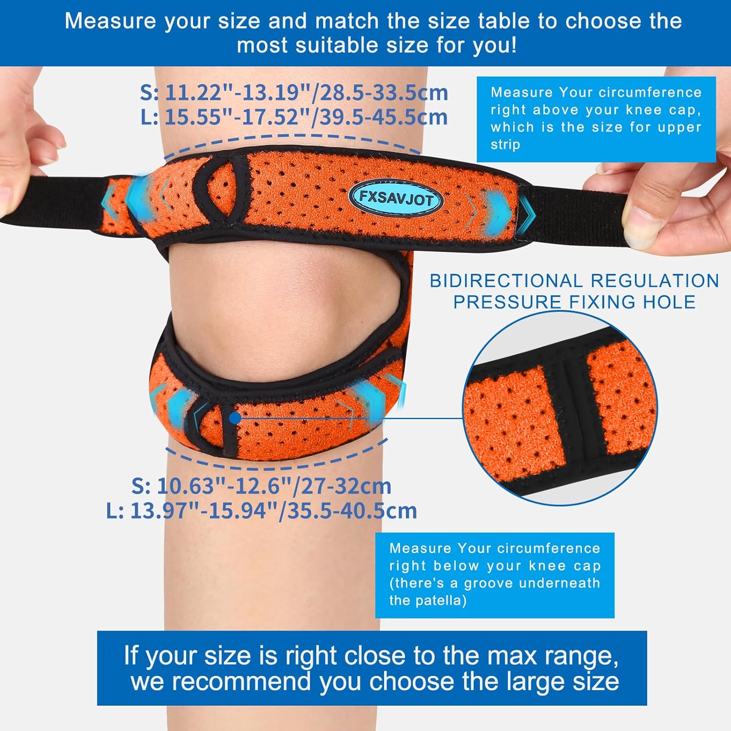 Structured patella support design – The double-reinforced straps are made of high-quality, lightweight, and flexible neoprene material that is breathable, non-irritating, and sweat-absorbent. Two silicone cushion pads on the front side help support and protect the patella, increase shock absorption, compression strength, and impact resistance, which can effectively relieve knee pain.