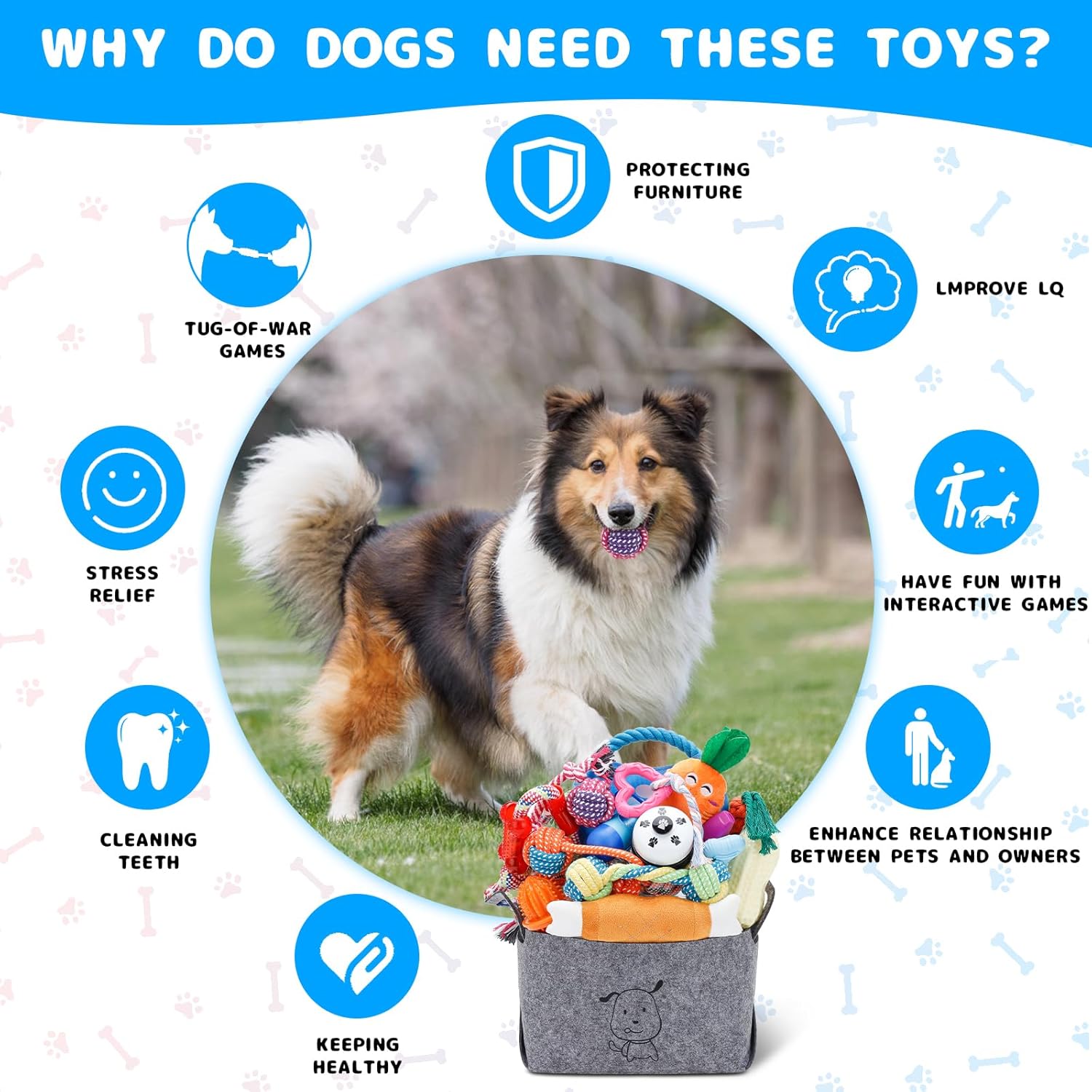 🐕【A variety of dog toys】:Our puppy teething toys contain a variety of puppy toys to suit different play styles. The 9 dog rope toys provide hours of tugging and chewing fun, while the 5 rubber chew toys offer a satisfying chewing experience. The 4 plush squeaker toys provide softness and squeaky joy. Additionally, the training toys assist in teaching new tricks.