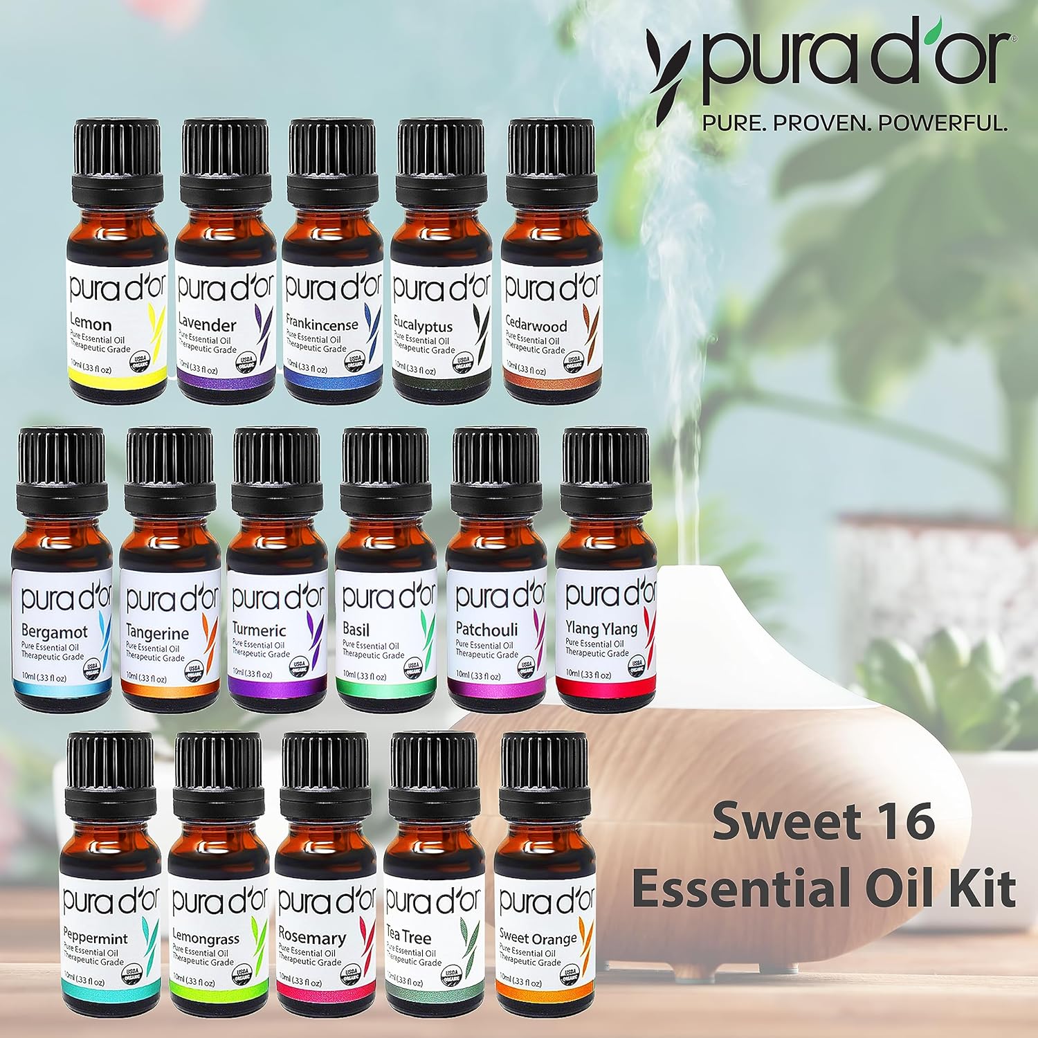 PURA D’OR Sweet 16 Essential Oils Set is a comprehensive collection of our finest hand-selected essential oils from different parts of the world. With a myriad of benefits, these oils for diffuser can also be used in a variety of ways–ranging from aromatherapy to skin application to household cleaners. This essential oils for diffuser set includes Cedarwood, Lavender, Sweet Orange, Rosemary, Lemongrass, Peppermint, Eucalyptus, Lemon, Patchouli, Basil, Tangerine, Tea Tree, Turmeric, Ylang Ylang essential oils. Compared to other beginner essential oils, our therapeutic grade products went through a 9-point rigorous examination and all oils are GC/MS tested for quality and purity. A complete aromatherapy essential oils starter kit for those who want to start incorporating essential oils into their daily wellness routine or personal care products. Because essential oils are highly potent, direct application without dilution can cause skin irritation, so it is always important to dilute any essential oils with water or a carrier oil to make it safe for topical application. Try mixing your favorite scents with PURA D’OR Almond or Coconut Carrier Oils for healthy-looking skin and hair. All PURA D’OR products are free from harsh ingredients and cruelty-free. Everything is developed and manufactured at our state of the art solar-powered facility in Southern California.