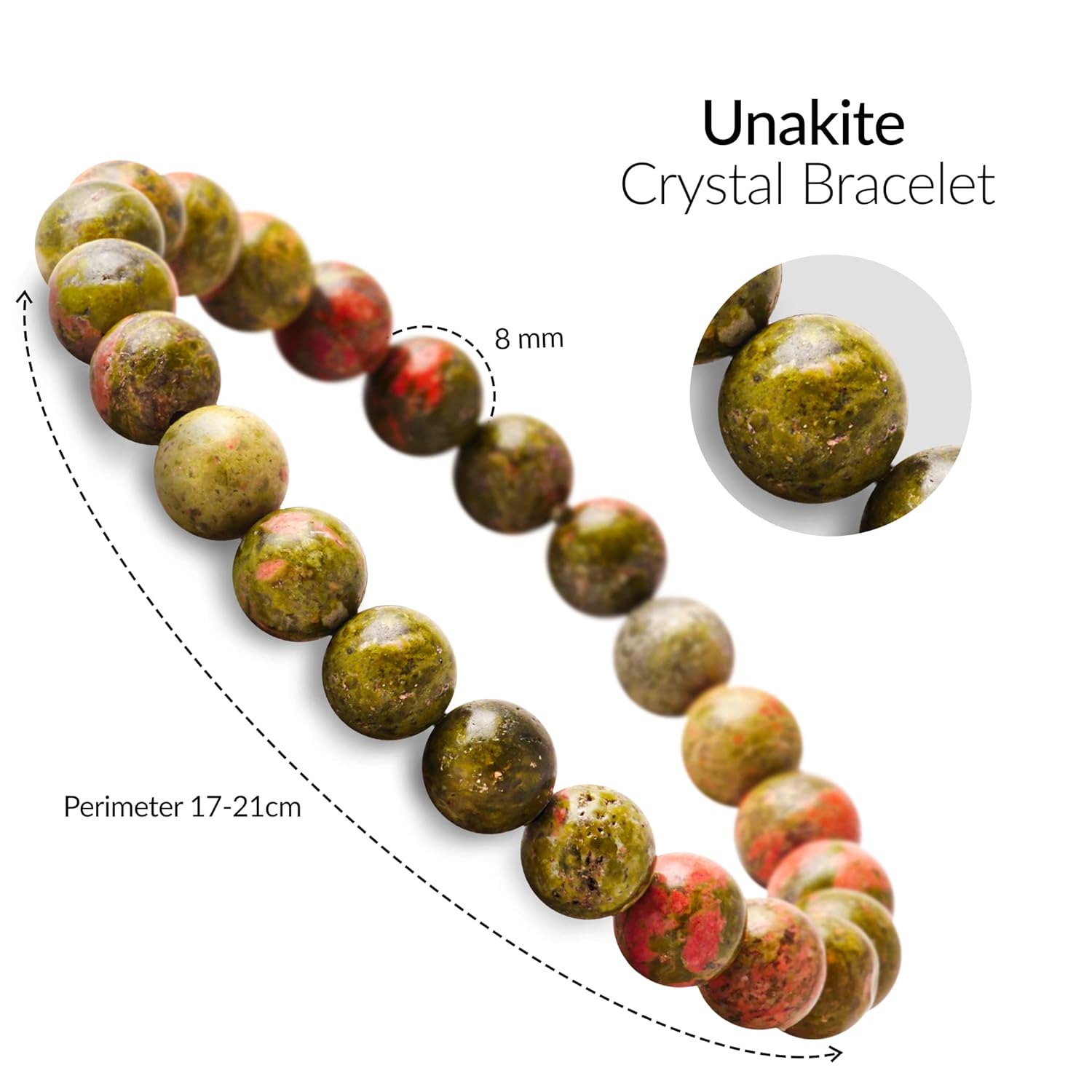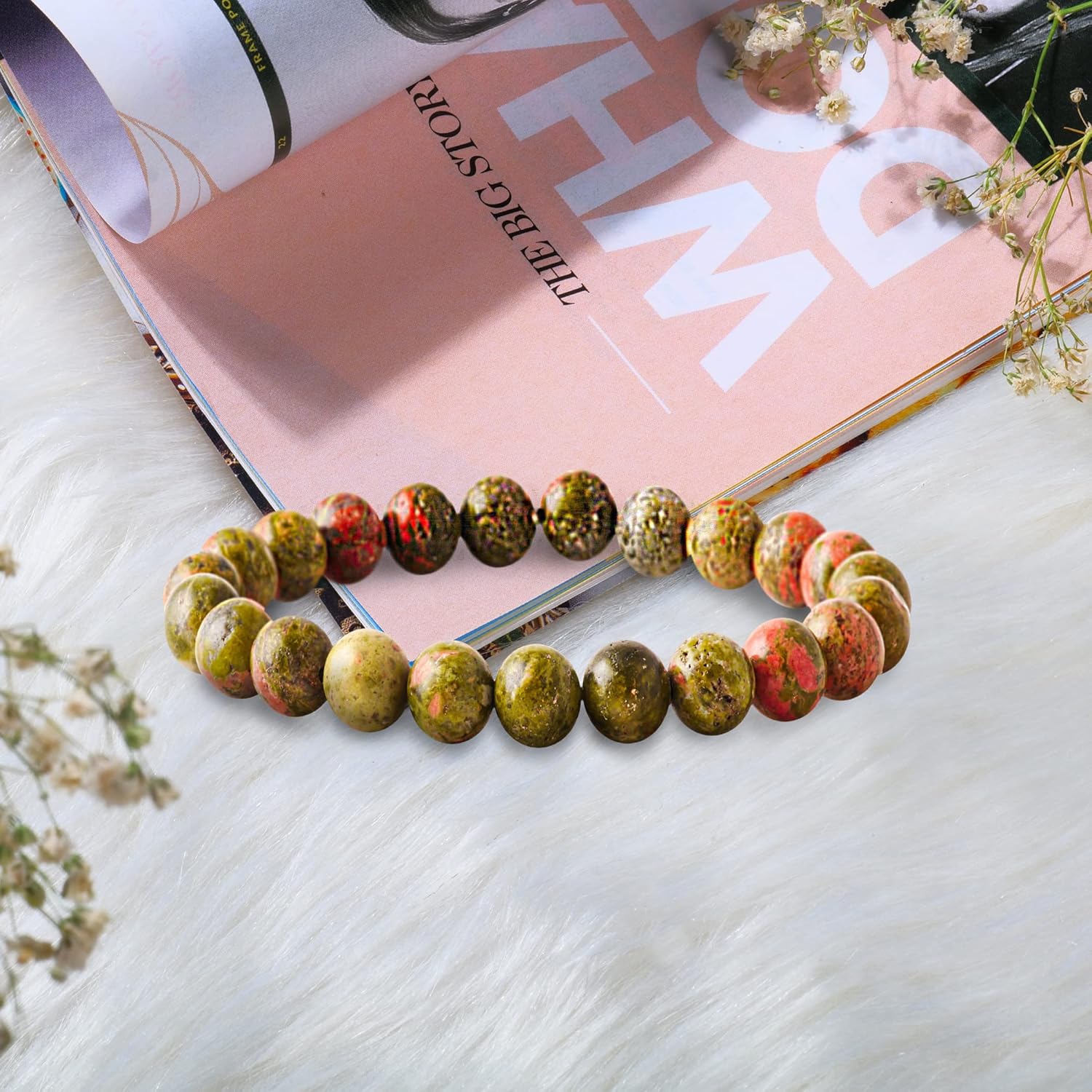 UNAKITE NATURAL GEMSTONE BRACELET: Well-crafted reiki healing stone bracelet length of 6-7 inches so that it can comfortably fit on your wrist. Ideal for both men and women, the bracelet can be paired with other jewelry. Please note that you will receive a bracelet similar to the picture but the stones may vary as each stone is unique and natural. (Each bead size 8mm approx.) It is a lightweight reiki bracelet for all crystal-loving persons.