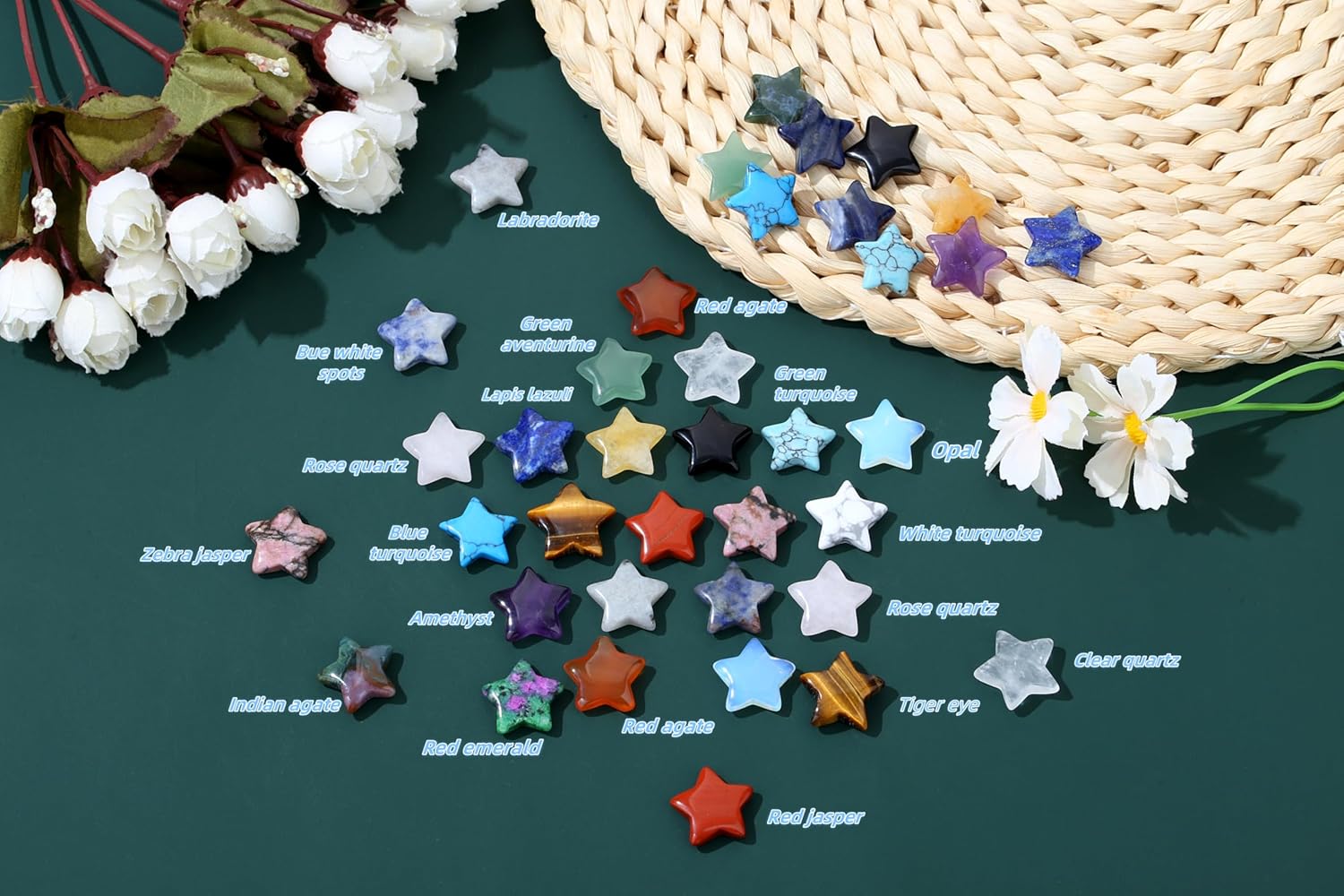 【 Basic Information 】20 Pcs Set (20 Colors Mini Star Crystal. (appro.)Size : 0.8*0.8*0.24″(2*2*0.6cm); Rose Quartz, Amethyst, Clear Quartz,Opal,White Howlite,Tiger Eye,Topaz,Green Aventurine, Indian agate,Lapis, Blue Turquoise,Red Jasper, Red CarnelianTurquoise,Unakite,Grey Labradorite,Black Obsidian, Blue Sodalite.
