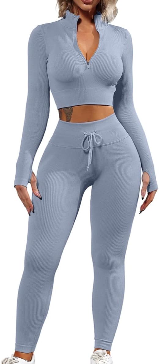 10 reviews for QINSEN Long Sleeve Workout Shirt for Women High Funnel Neck Crop Tops Tummy Control Leggings Fitted 2 Pieces Sets