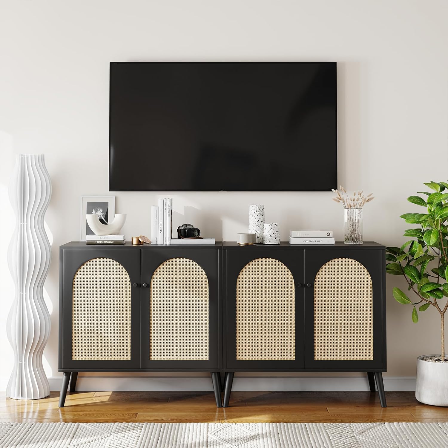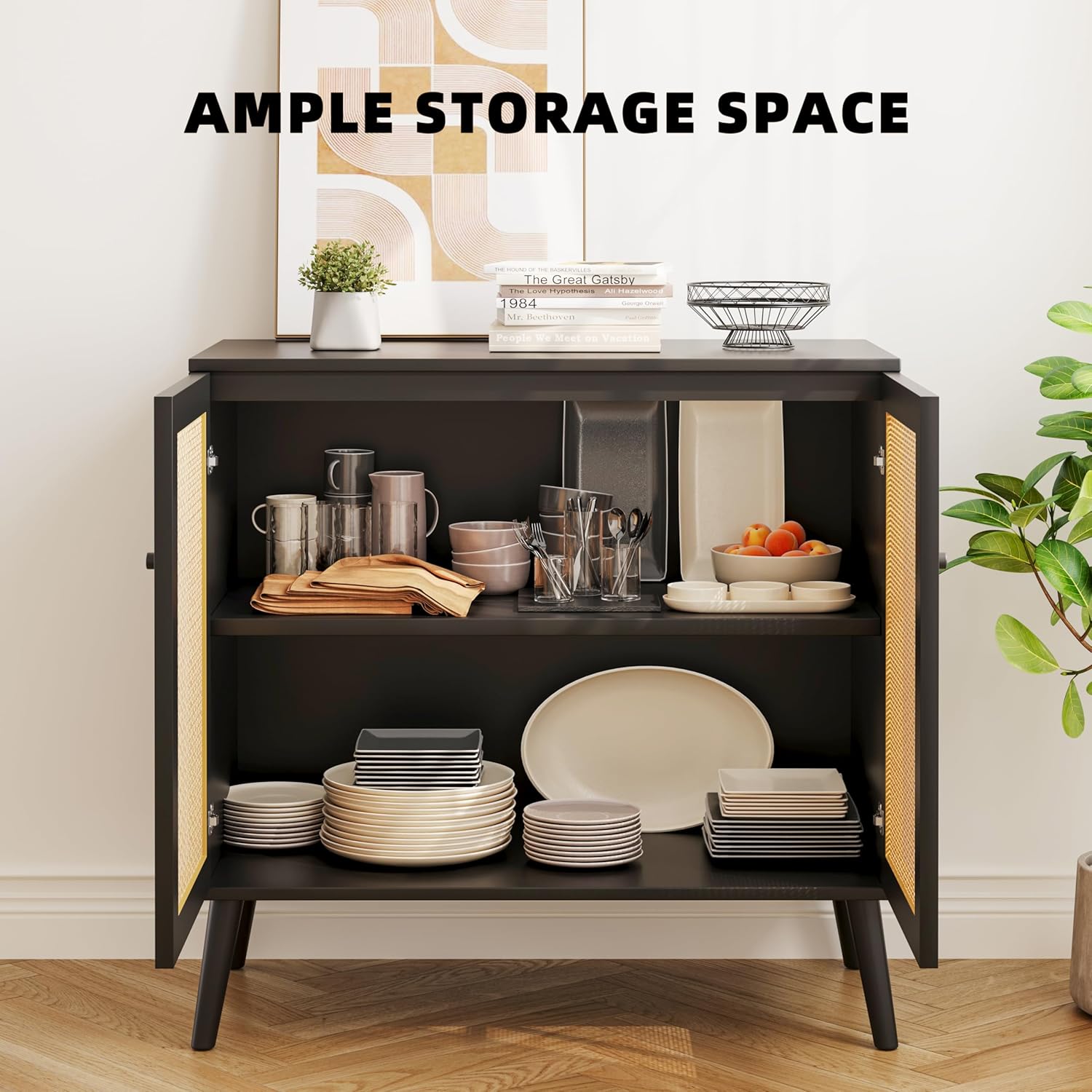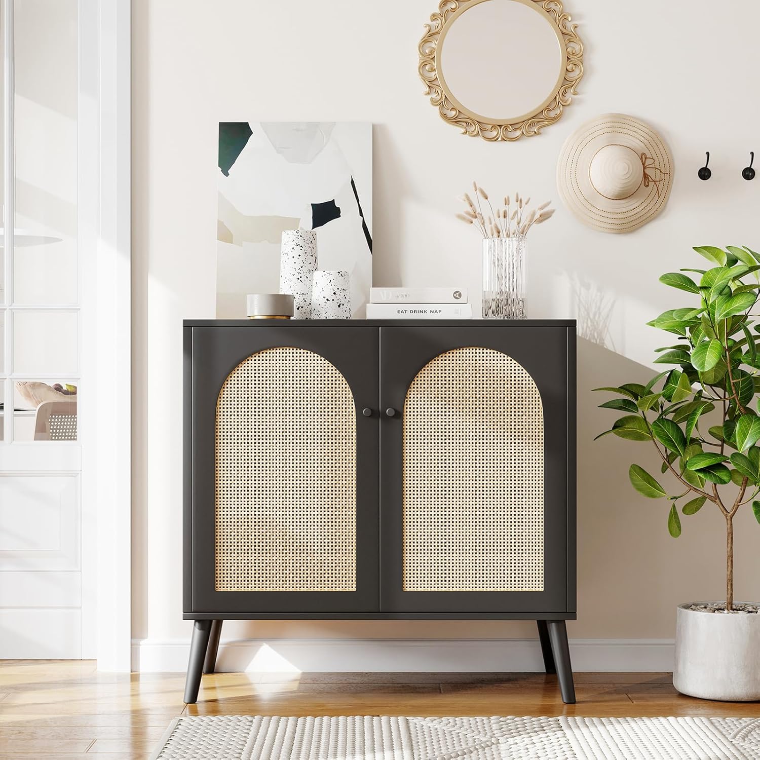 Black Buffet Cabinet: This rattan buffet cabinet with storage is a versatile piece that can serve as a rattan furniture or a boho cabinet credenza in your living room, adding a touch of elegance and sophistication.