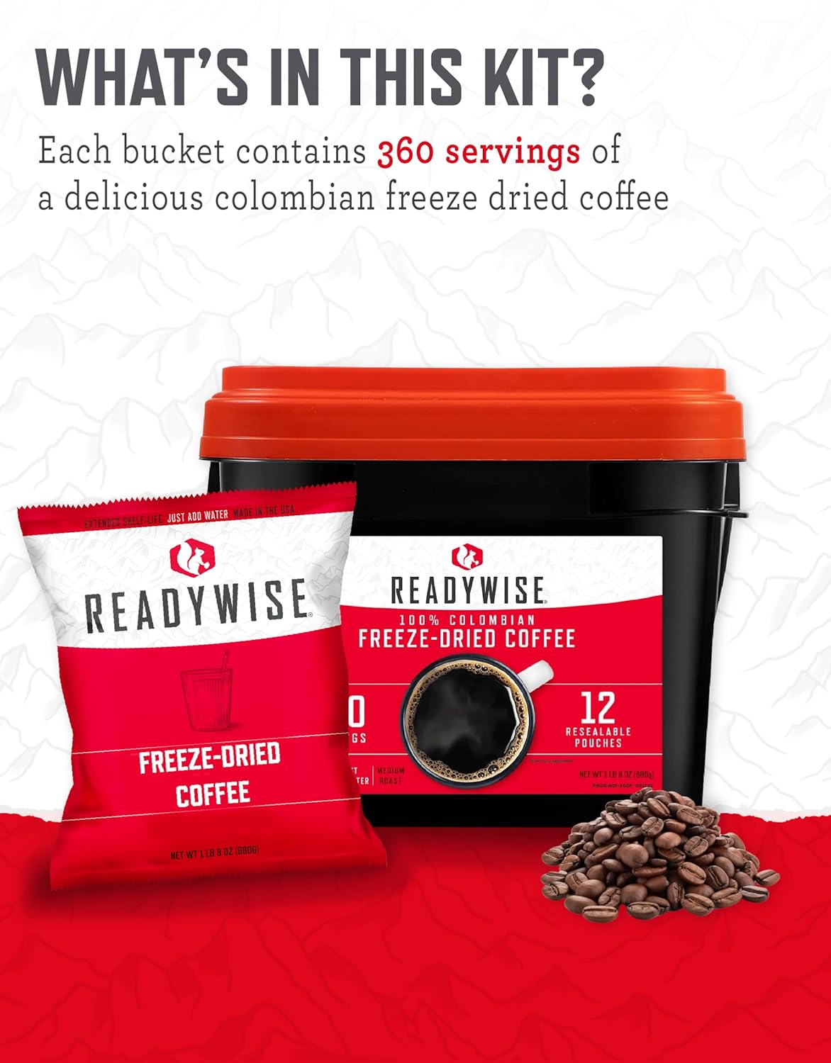 READYWISE – Freeze-dried Coffee Bucket, 360 Servings, Emergency, Meal & Drink Supply, Freeze Dried Survival Drink for Hiking, Adventure and Camping Essentials, Resealable Pouches