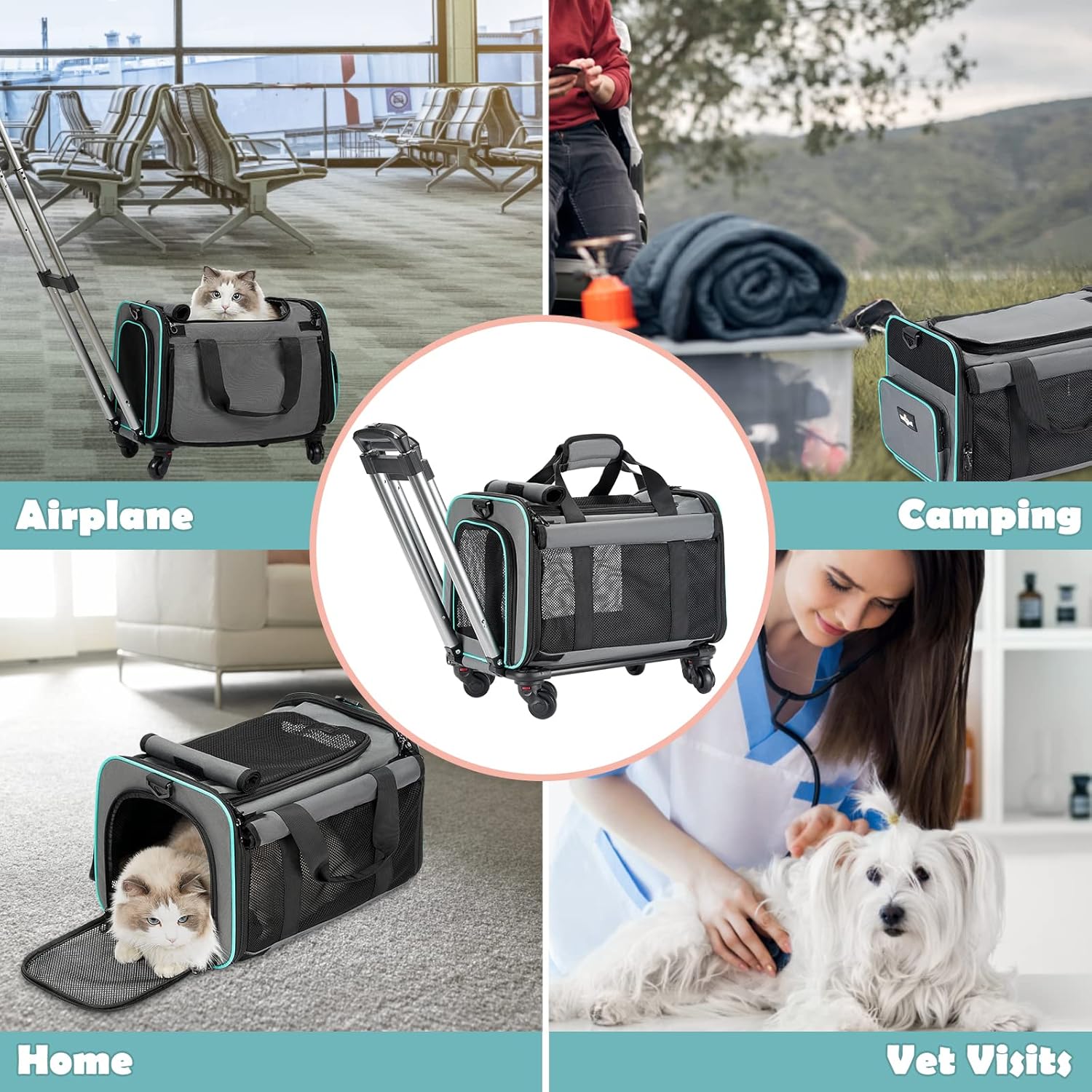 Rolling Pet Carrier with Wheels, Foldable Airline Approved Dog Carriers for Small Dogs and Cats, Cat Carrier on Wheels, Pet Travel Carrier for Flight Camping Outdoor