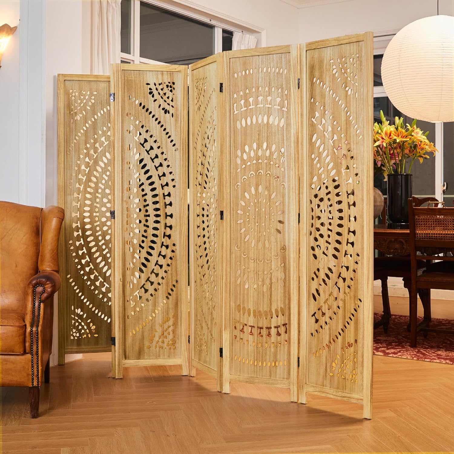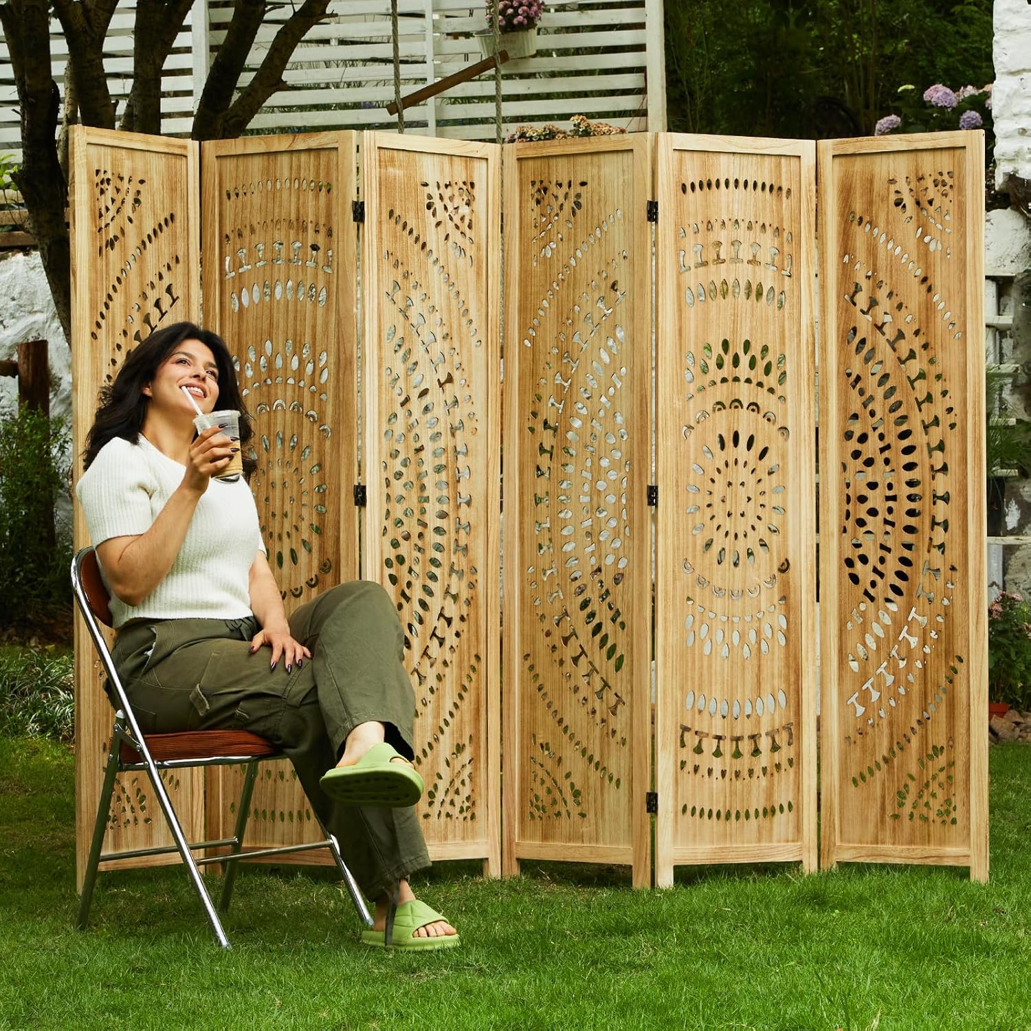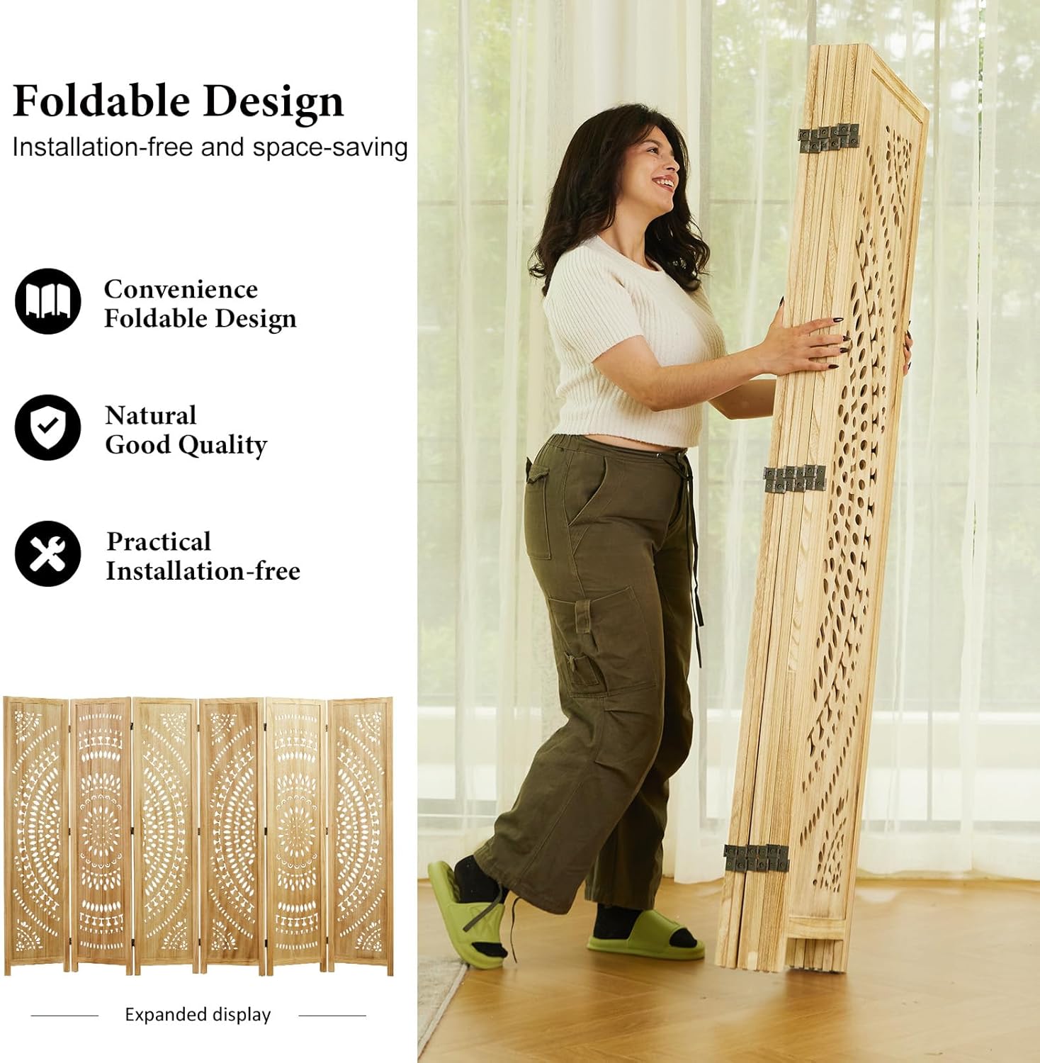 Room Divider Wood Carved Wall Divider Indoor Folding Bohemian Style Portable Partition Screen for Home Office Garden Terrace – 6 Panels (Natural)