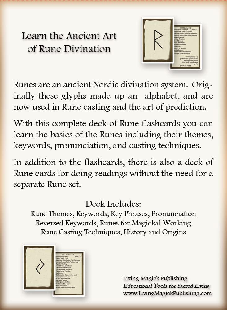 The Futhark Runes Learning Card Deck is intended to be used as a self study guide for committing the meanings and associations of the symbols to memory ~ Supplement this deck with the Living Magick “Runes Quick Reference Sheet”.
