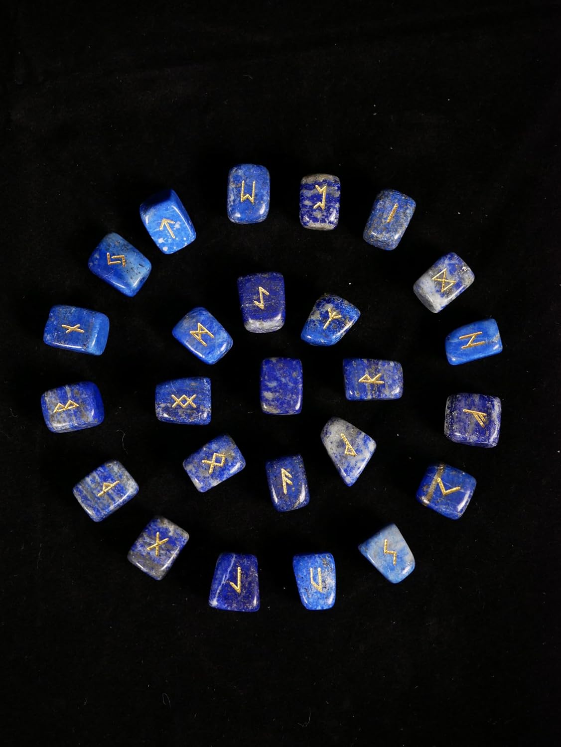 1- Lapis Lazuli Rune Stones Set of 25 stones, including 24 stones with engraved runic alphabet by gold lettering and one blank stone.
