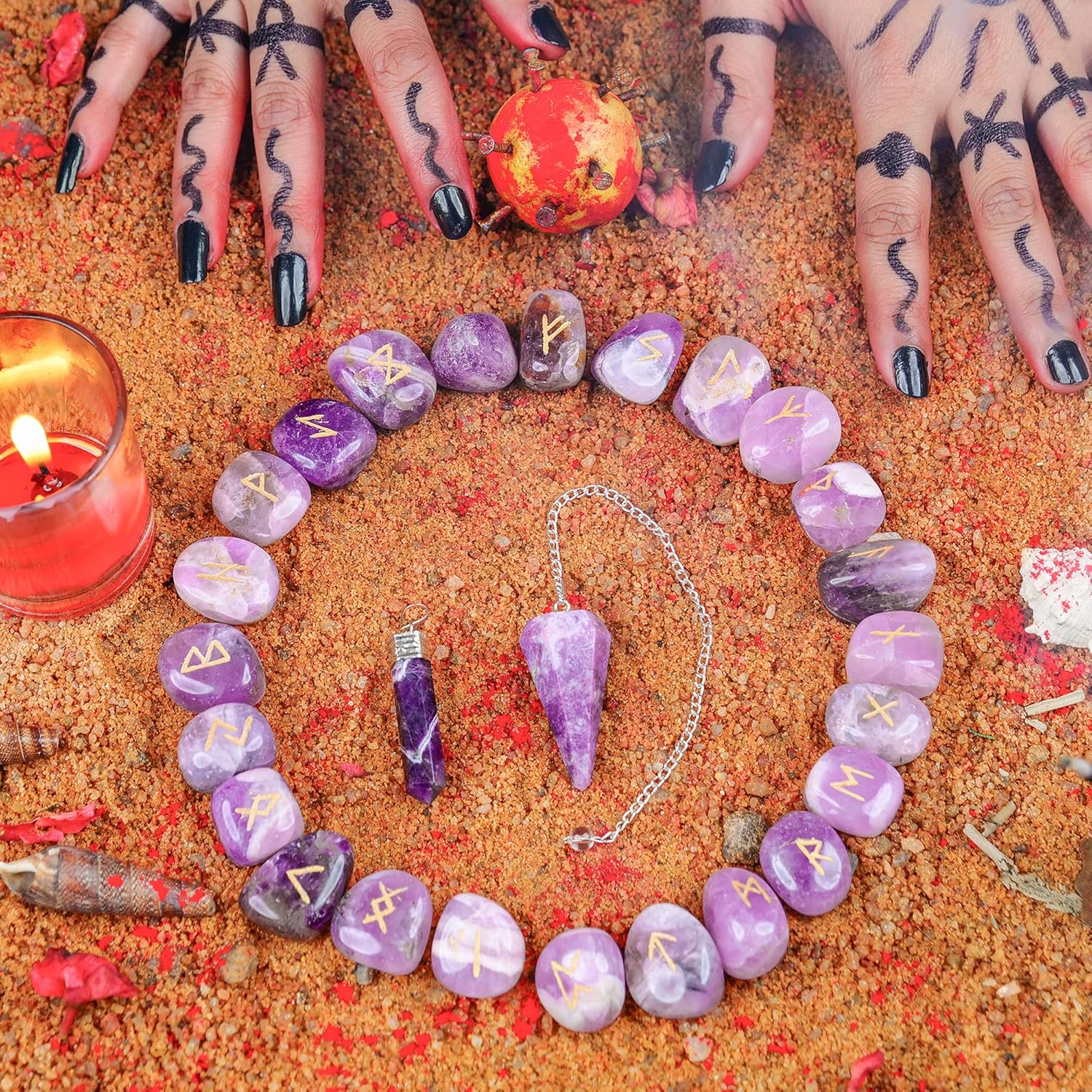 The runes themselves are stunning amethyst and the pendant is beautiful. Only gave 4 stars because the pendulum came in broken