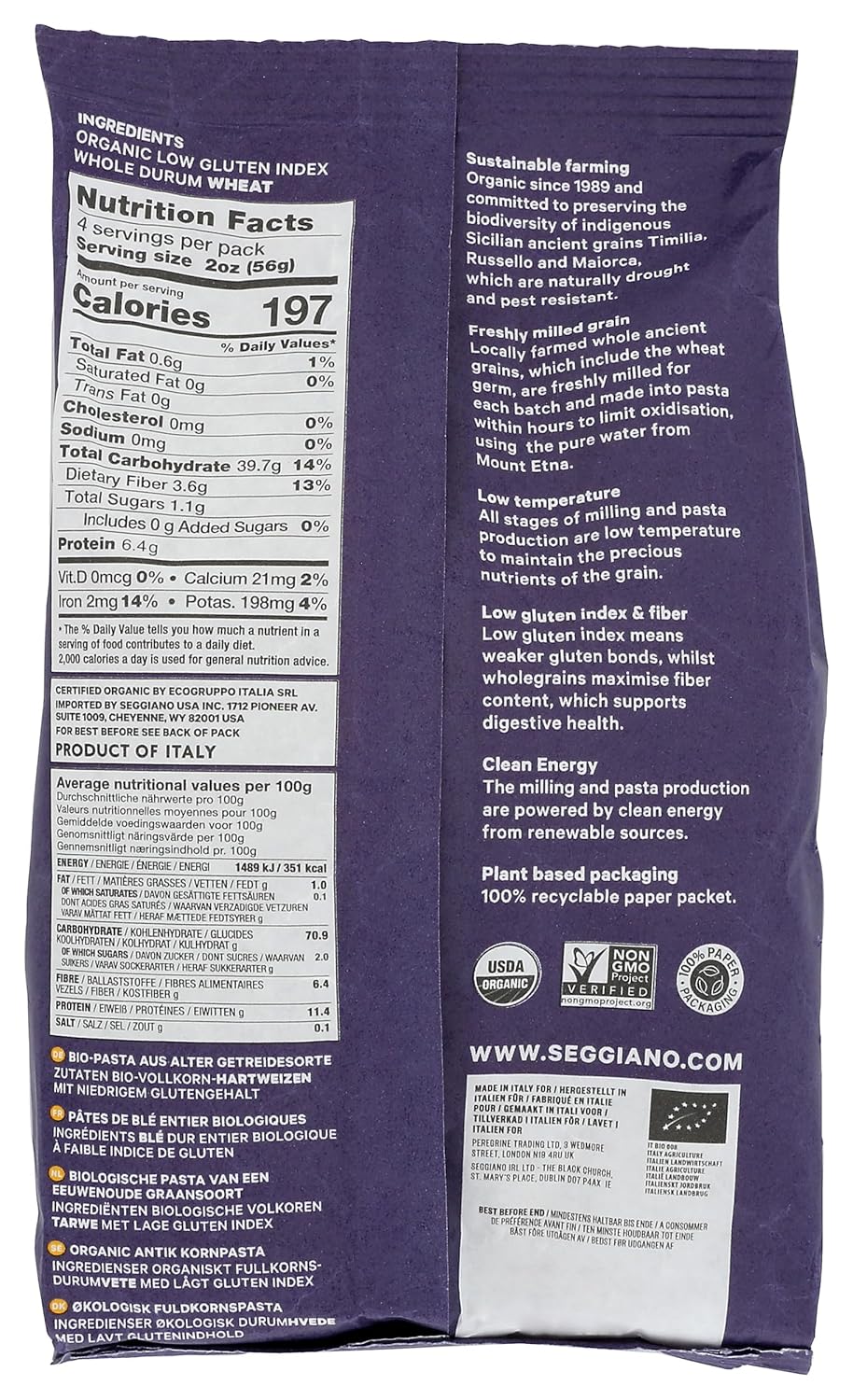 SEGGIANO Organic Ancient Grain Whole Wheat Busiate, 8.8 OZ
