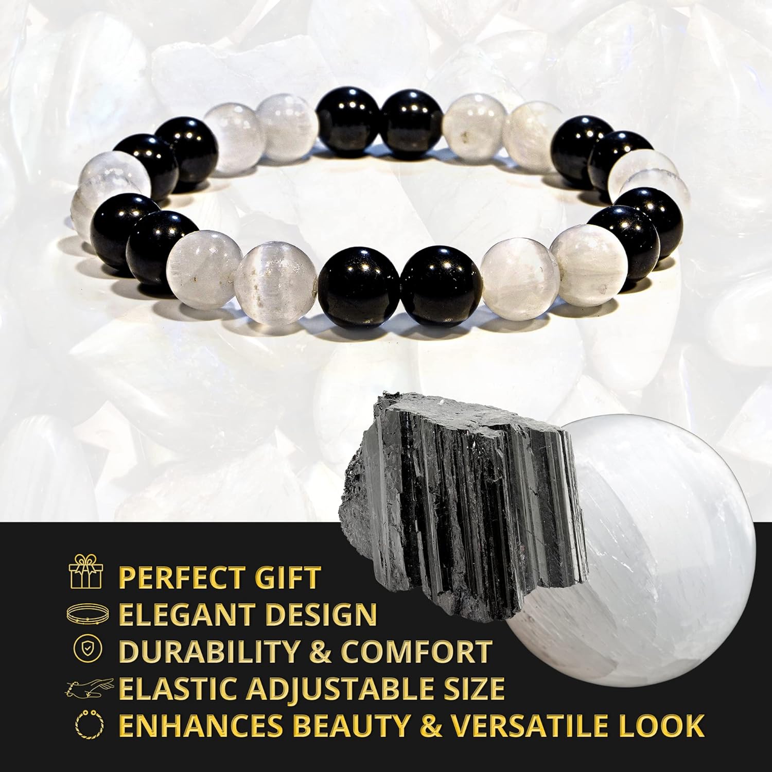 Elegant Accessory for Every Woman: Our beaded Selenite & Black Tourmaline bracelet is a must-have for women seeking both style and energetic harmony.