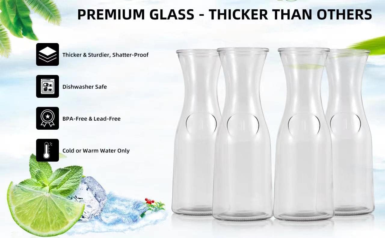 PREMIUM THICKER GLASS: This carafe is made of thicker glass which makes the bottle much more stronger and durable than some other flimsy carafes. With this thickened glass, it has nice shatter-resistance and crack-resistance and totally lead-free, BUT NOT FOR BOILING AND HOT WATER. Also, it is dishwasher safe, very convenient for daily and party use.