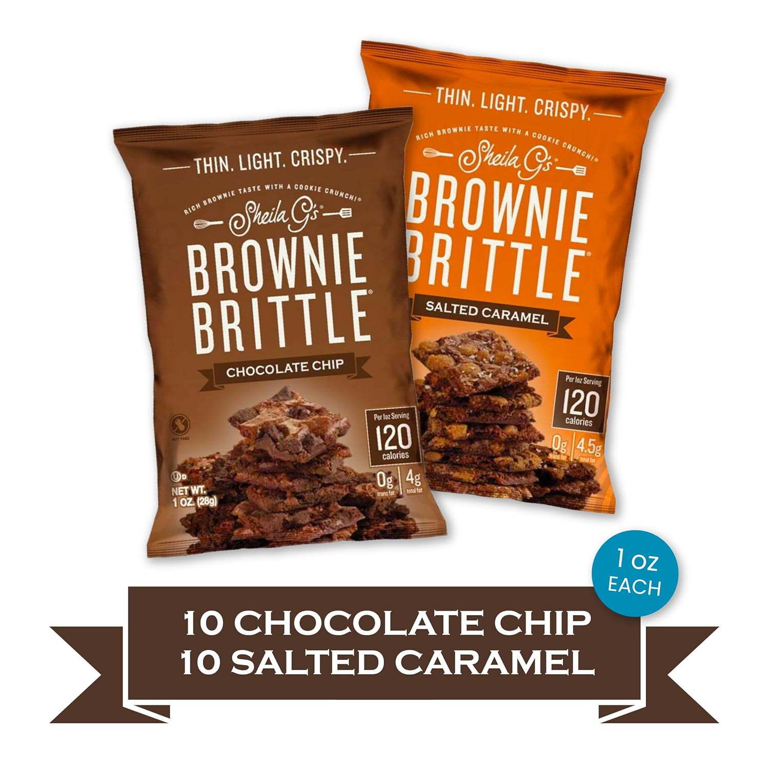 Having a hard time deciding between our two top flavors? Now you don’t have to! In this Brownie Brittle Variety Pack, you’ll get 10 bags of each of our best-selling flavors. There are 10 x 1oz Chocolate Chip Brownie Brittle and 10 x 1oz Salted Caramel Brownie Brittle bags. These bulk snacks are portion-perfect 120 calorie packs to keep you on track and snack satisfied. Brownie Brittle is a gift that keeps on giving. Use the broken pieces and crumbs as a topping on your favorite ice cream, yogurt, whipped coffee or as a base for cheesecake or pie crusts. These portion-perfect, unique snacks in bulk are great when hosting parties or keeping in the pantry to throw in your bag or purse. They also make great office snacks or school lunch treats for the kiddos. Like the crispy edge of a gourmet brownie, Sheila G’s multiple award-winning Brownie Brittle satisfies your chocolate desires with a treat you can feel good about. So, crave away with these thin, rich pieces of chocolate decadence that have a signature cookie crunch. No more fighting for the corner pieces!