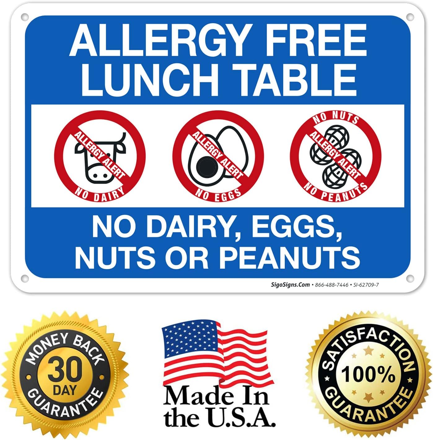 Sigo Signs, Allergy Free Lunch Table No Dairy Eggs Nuts Or Peanuts Sign, 10×7 Inches, Rust Free .040 Aluminum, Fade Resistant, Made in USA