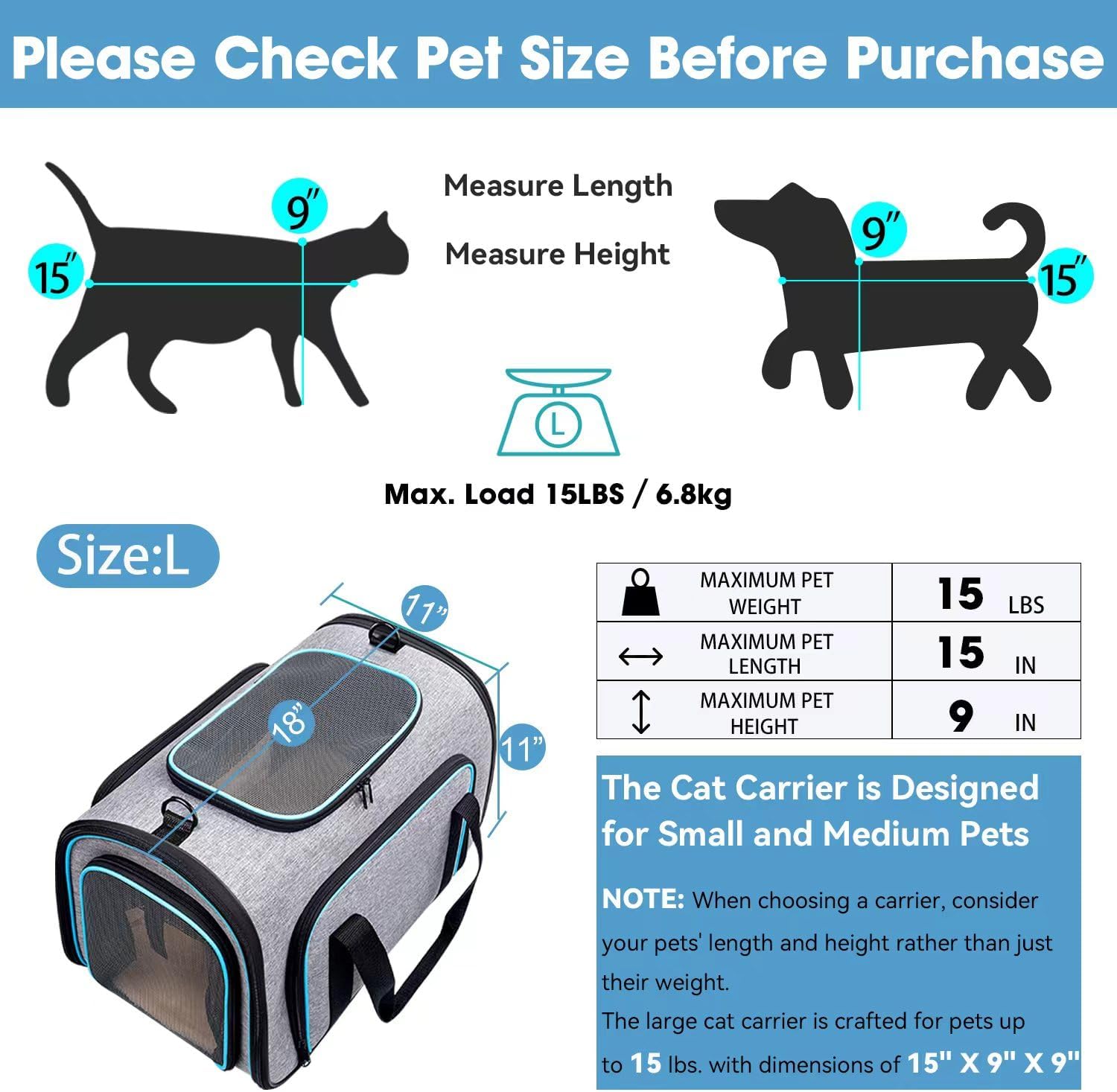 AIRLINE APPROVED CAT CARRIER:Before purchasing the Siivton pet carrier, please ensure that your pet’s size is suitable for the carrier. We recommend that your pet’s dimensions fall within 15”x9”x9”(smaller than product) , with a weight not exceeding 15 pounds. Please be aware that selecting based solely on weight may be inaccurate, so when making a purchase, refer to your pet’s length and height. This ensures that your furry friend can comfortably enjoy wearing our carrier. Our goal is to provide the best travel experience for your pet, and choosing the right size is crucial to achieving this goal