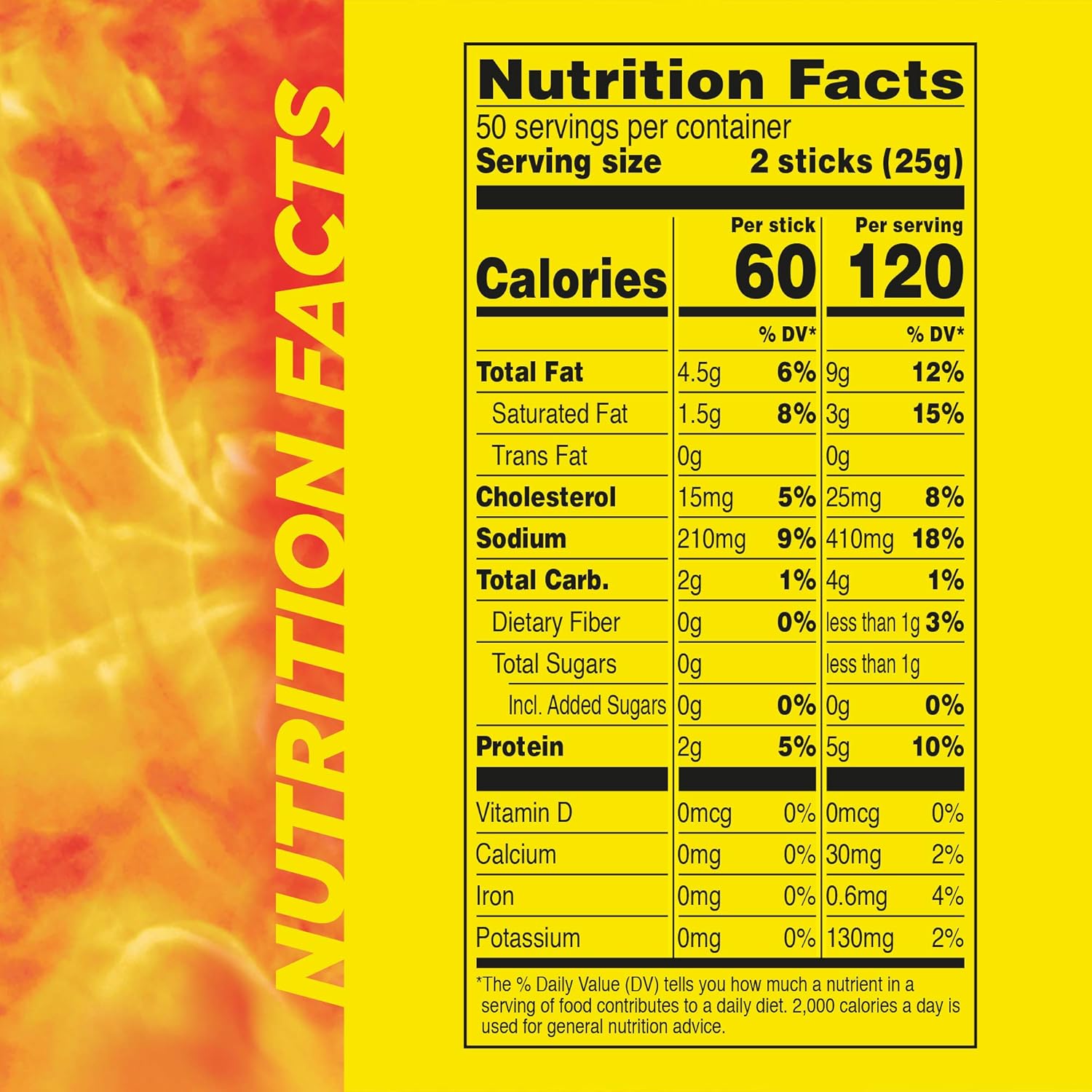 Slim Jim Original Smoked Meat Sticks are keto friendly* and fit a low carb* lifestyle … if you’re into that kind of thing. More importantly, the bold, in-your-face spicy flavor is crazy good. This tasty jack-of-all-trades goes anywhere: Stow a pack in the car, under the bed, in the golf cart or even at tonight’s dinner party at your vegan aunt’s house. Grab an individually wrapped smoked meat snack and hit the road. These meaty snack sticks are made with no artificial flavors, no artificial colors and a combination of beef, pork and chicken. Snap into a Slim Jim and snack like the beefy boss you know you are. * 2 g protein, 2 g net carbs (2 g total carbohydrates minus 0 g dietary fiber) and 0 g added sugar per 0.44 oz. stick