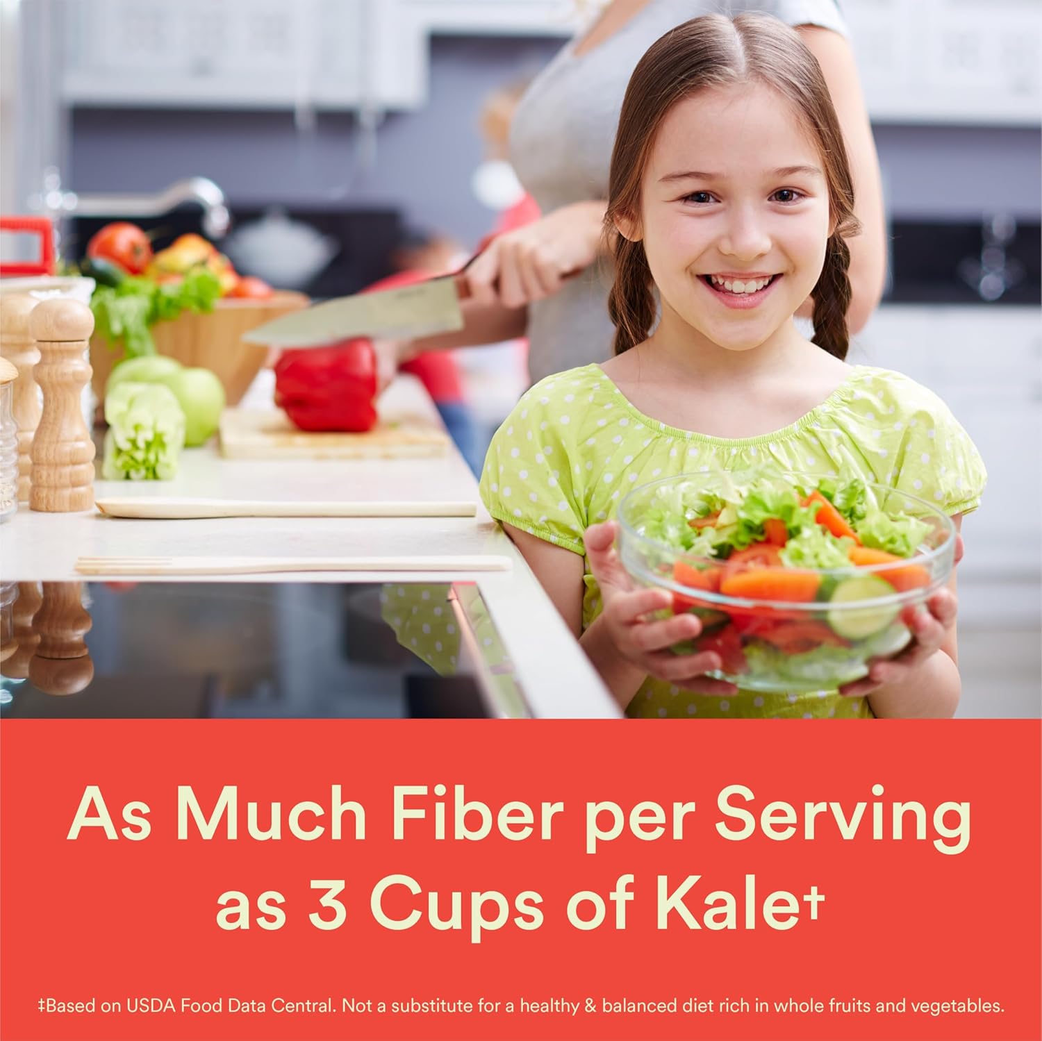 SAME AMOUNT OF FIBER AS 3 CUPS OF KALE**: US children meet only 45% of the daily value for fiber.** Each gummy serving contains the same amount of fiber as 3 cups of kale** so your child gets more of what they need to maintain regular digestion*