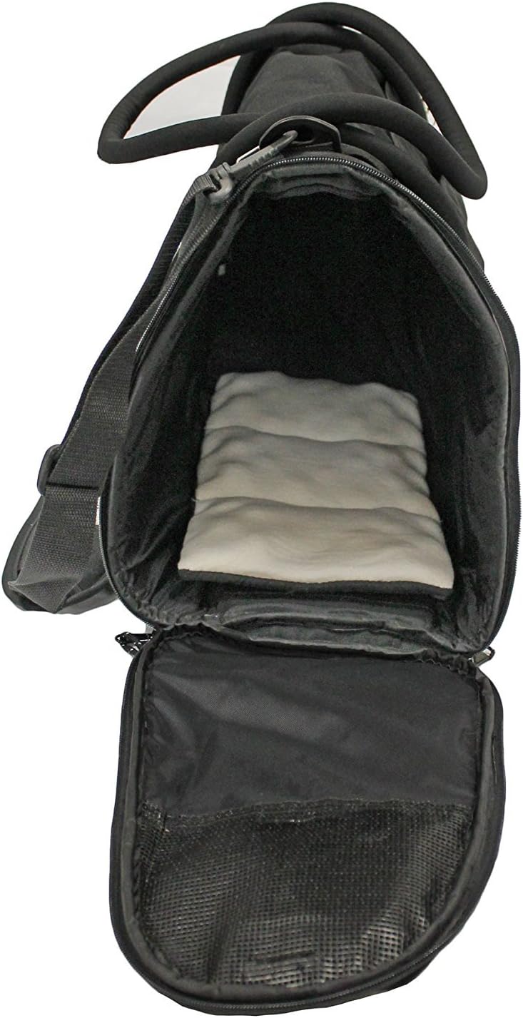 I bought this bag to transport my 7.5lb chihuahua mix. I returned it instantly because the bag doesn’t have any structure and instantly collapses making it uncomfortable for a pet inside. This carrier would only be useful if it was carried the entire time which keeps the top and sides from caving in. I wouldn’t recommend it for a pet at all.