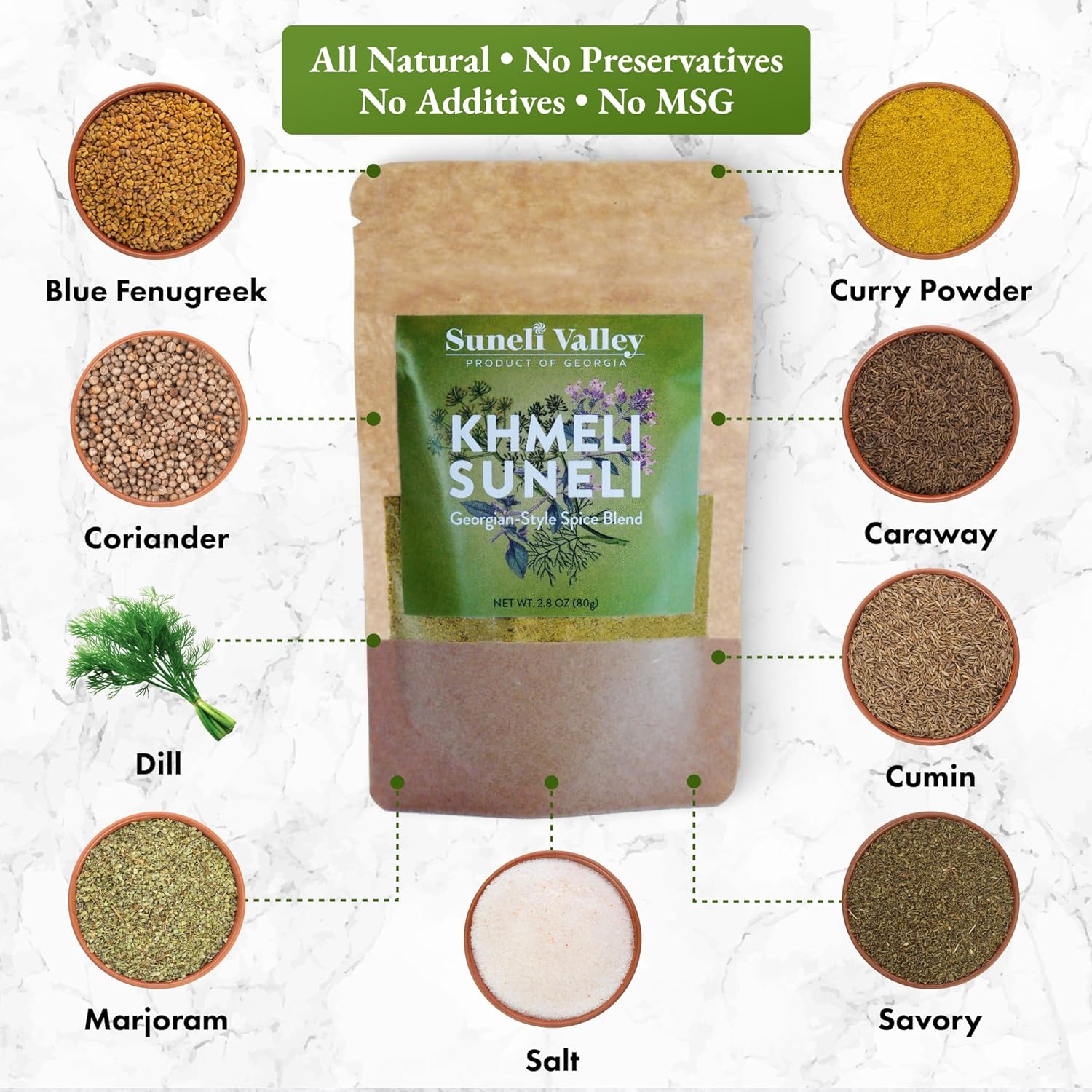 NATURAL AND AUTHENTIC: Committed to quality, Suneli Valley ensures that each pouch of Khmeli Suneli is filled with natural, non-GMO spices, free from additives and preservatives, delivering authentic flavors to your kitchen.